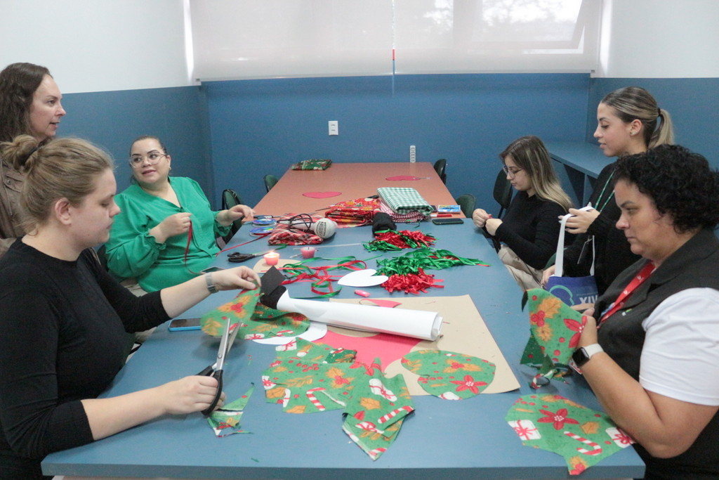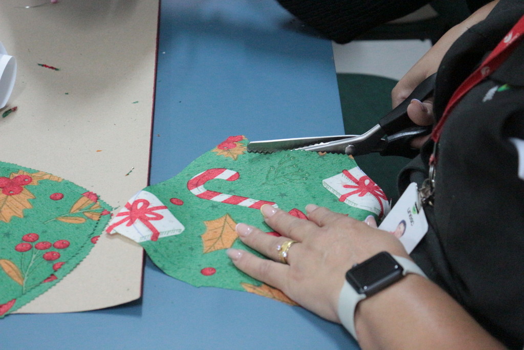 As oficinas ensinam a confeccionar guirlandas com tecidos e bolas de Natal, sempre valorizando a criatividade dos participantes. A atividade também serve como um momento de descontração e interação entre colaboradores de diferentes setores da Unesc.