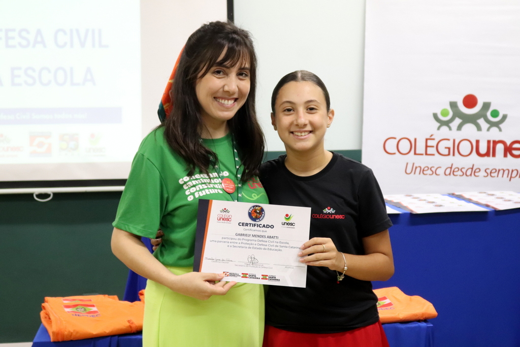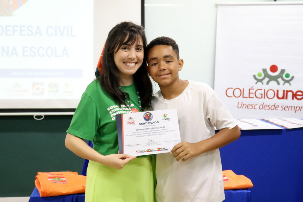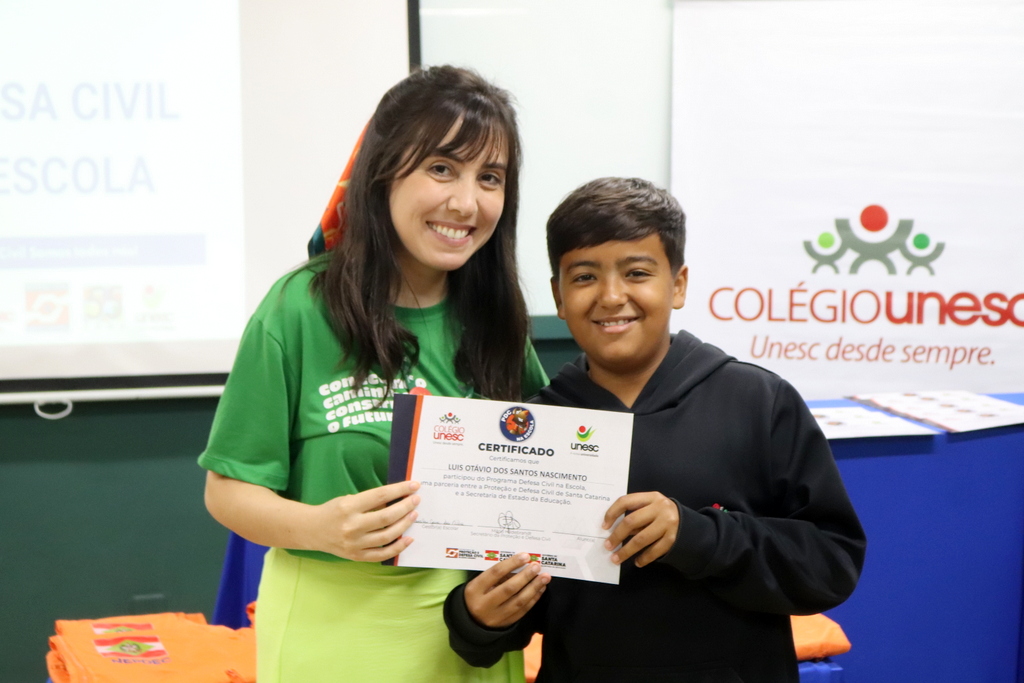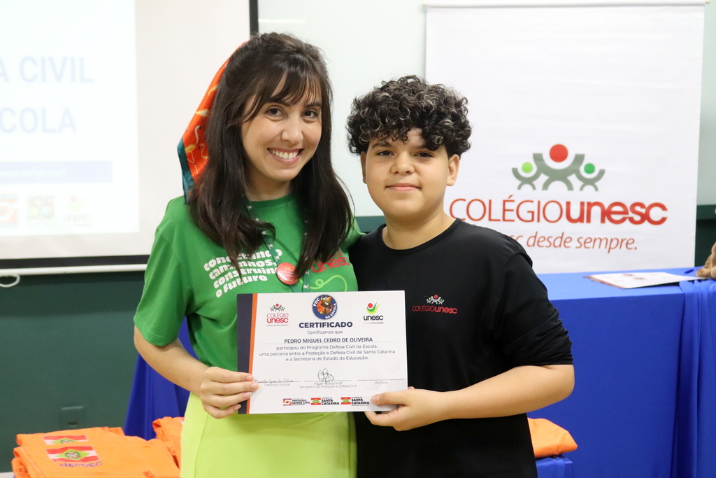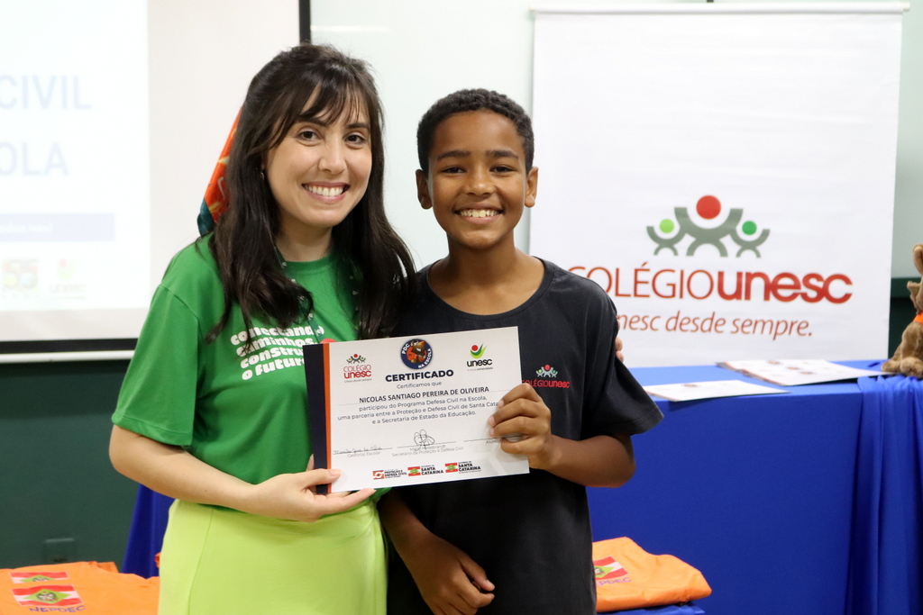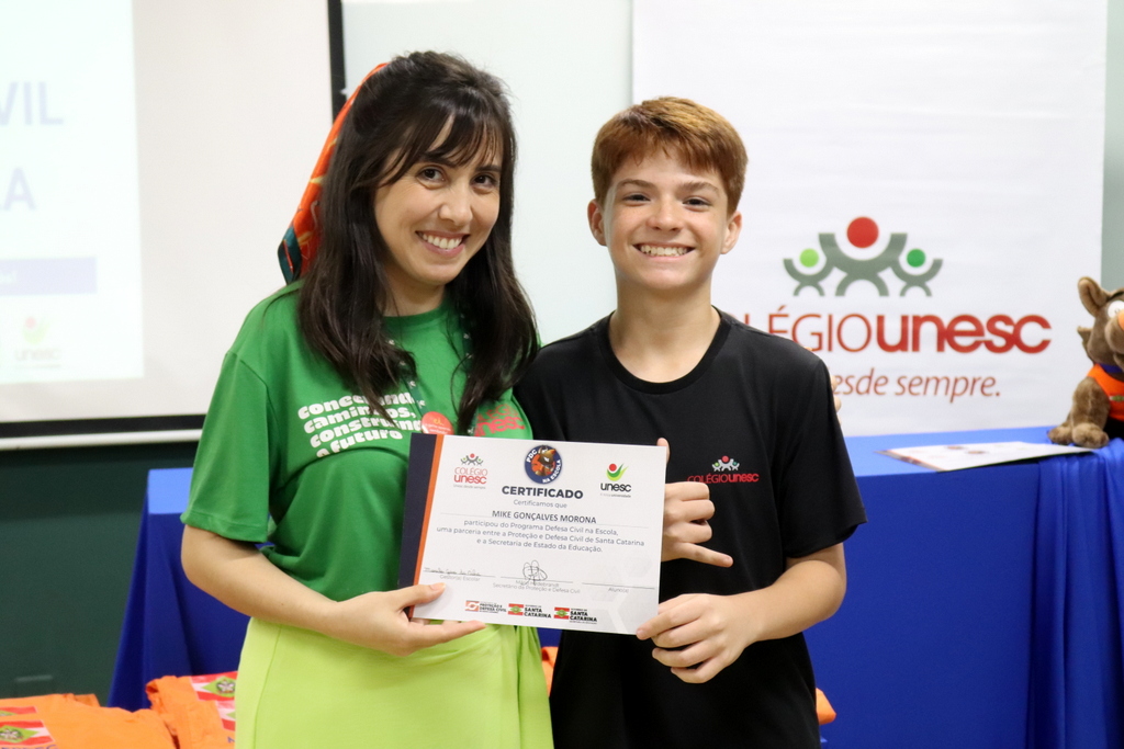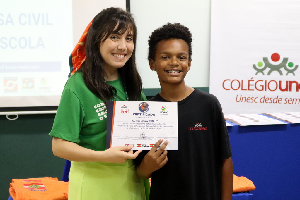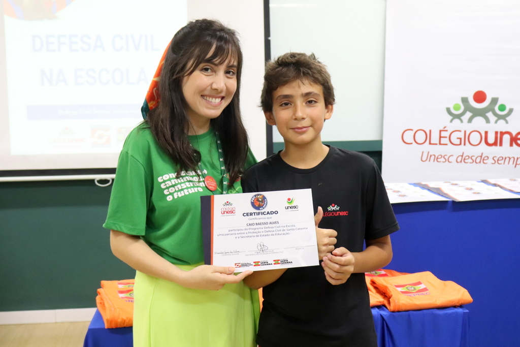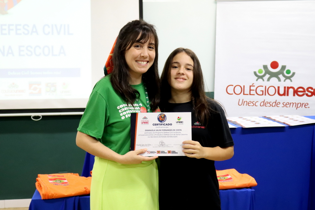 Na manhã desta quarta-feira (3/12), alunos do 6º ano do Colégio Unesc participaram da formatura do programa Defesa Civil na Escola, em cerimônia realizada na Instituição. O programa trabalha com turmas do Ensino Fundamental – Anos Finais, com foco no ensino, na aprendizagem, na participação e na criatividade. A proposta da Defesa Civil de Santa Catarina busca ampliar a resiliência das comunidades frente a eventos adversos.