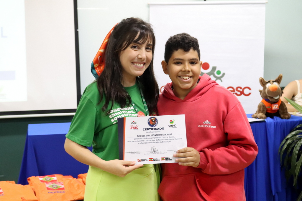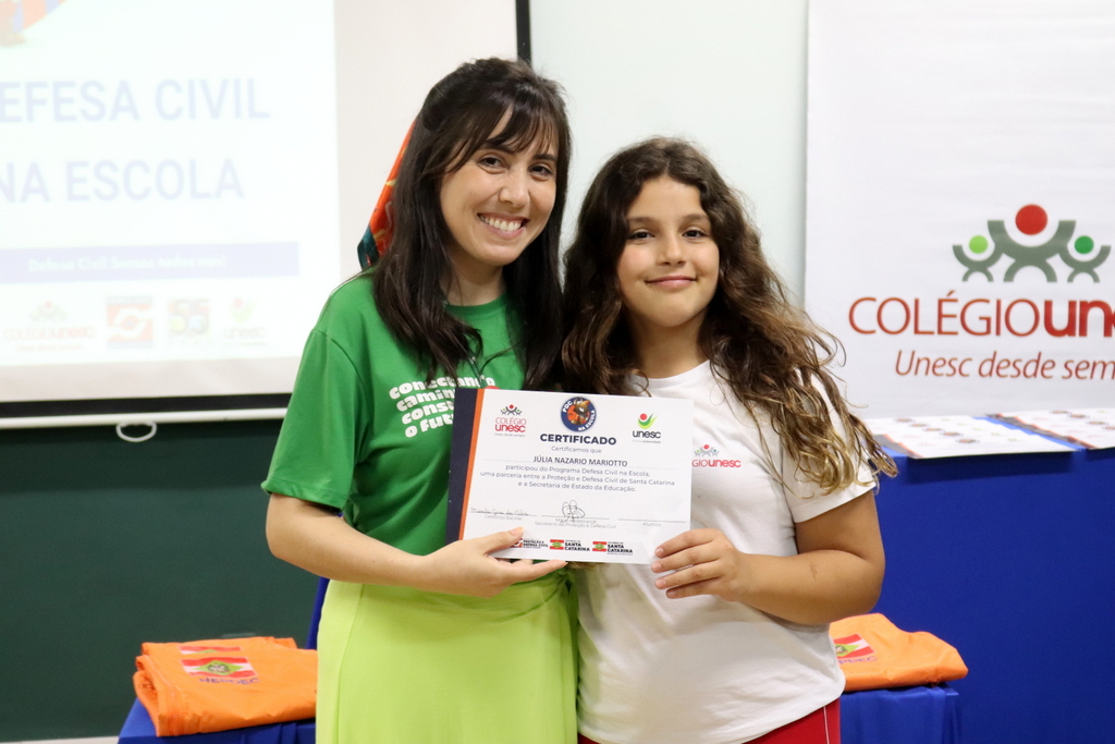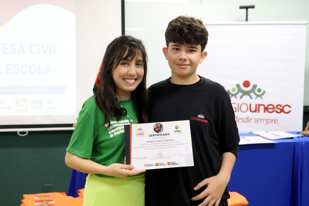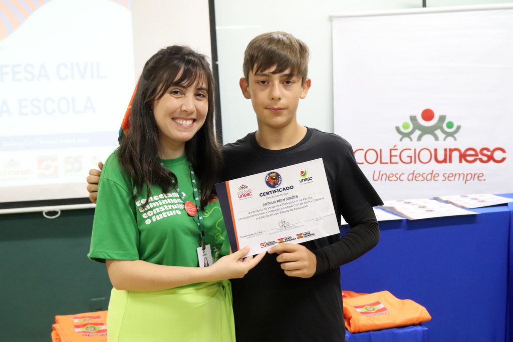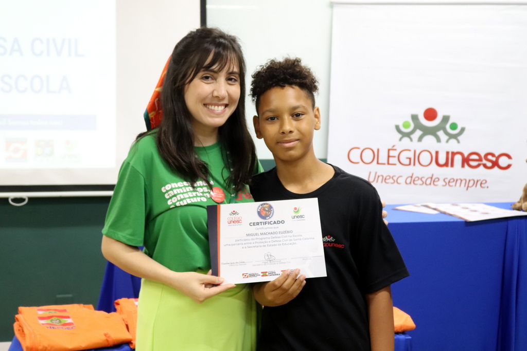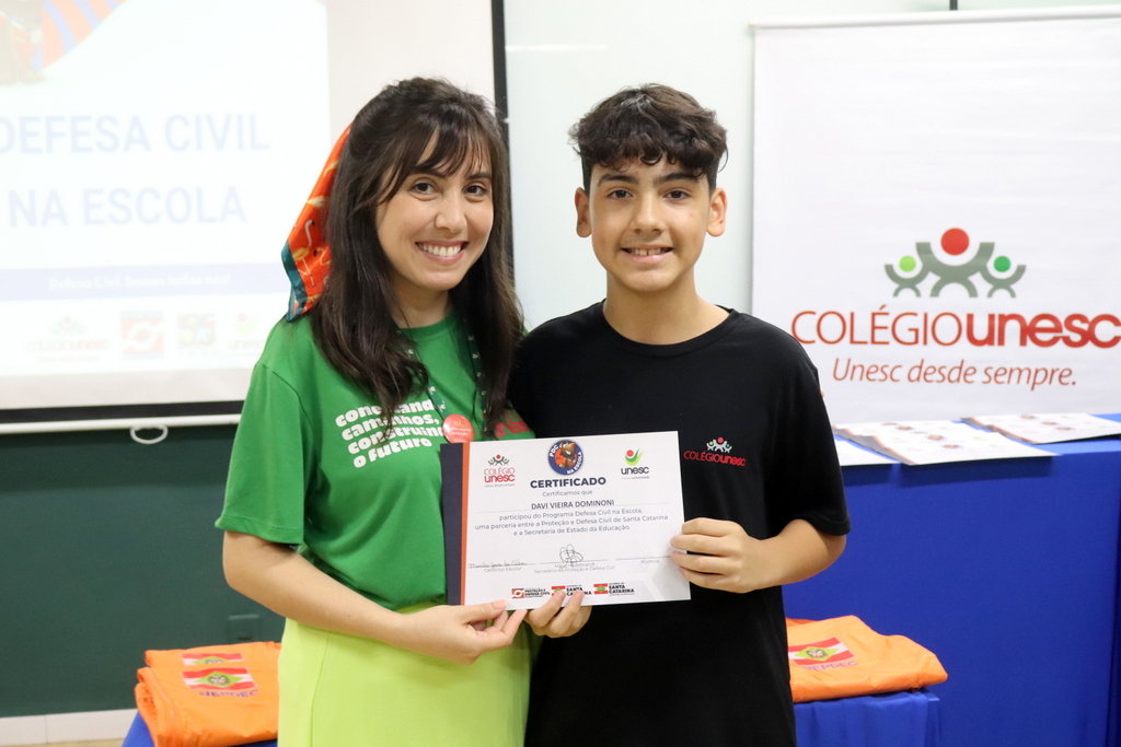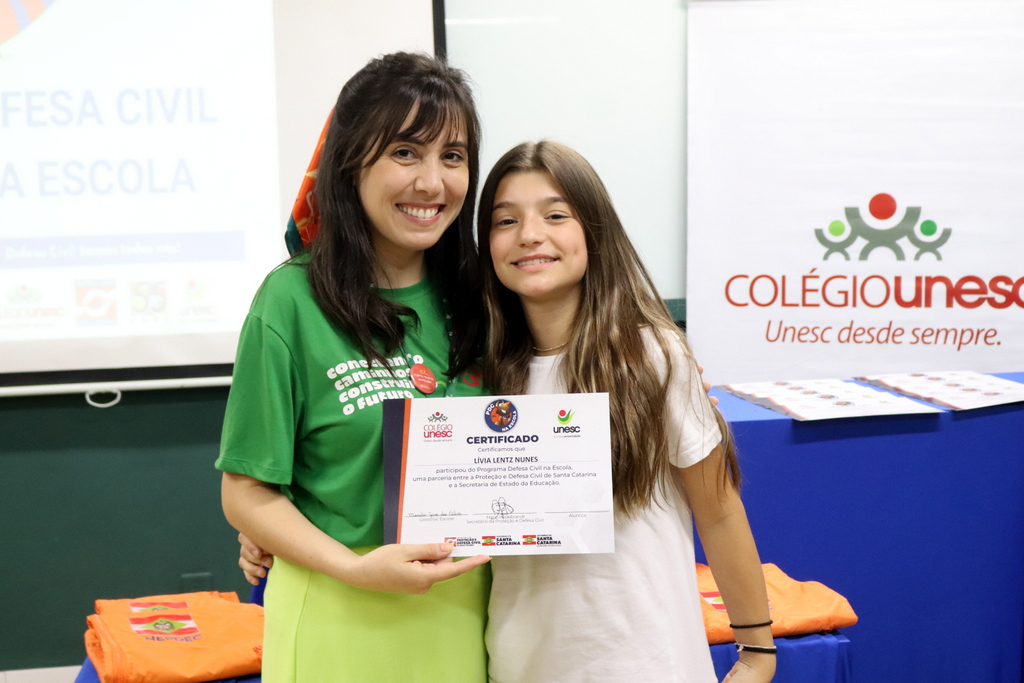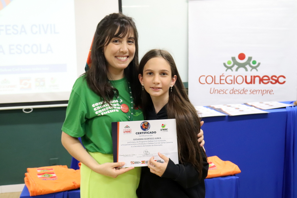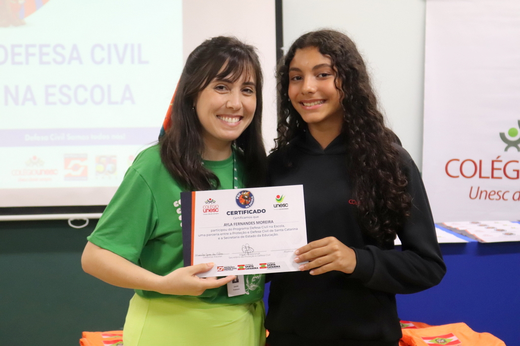 Na manhã desta quarta-feira (3/12), alunos do 6º ano do Colégio Unesc participaram da formatura do programa Defesa Civil na Escola, em cerimônia realizada na Instituição. O programa trabalha com turmas do Ensino Fundamental – Anos Finais, com foco no ensino, na aprendizagem, na participação e na criatividade. A proposta da Defesa Civil de Santa Catarina busca ampliar a resiliência das comunidades frente a eventos adversos.