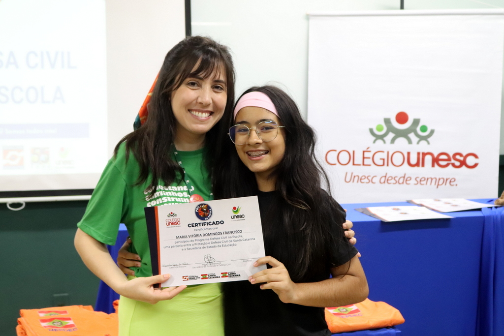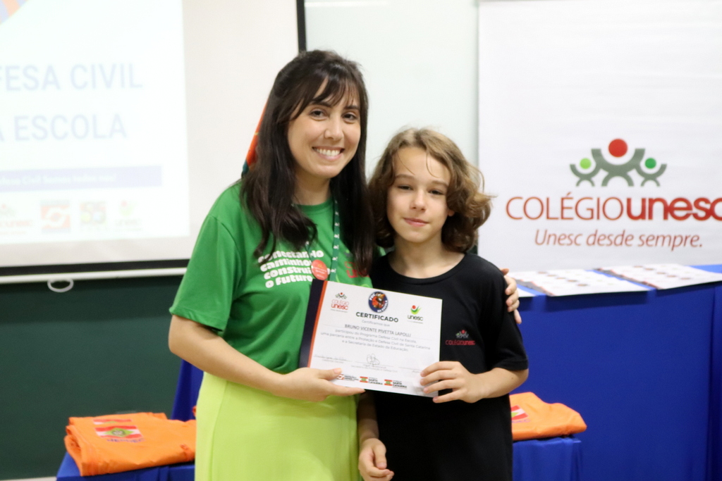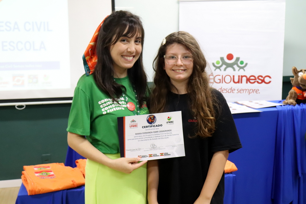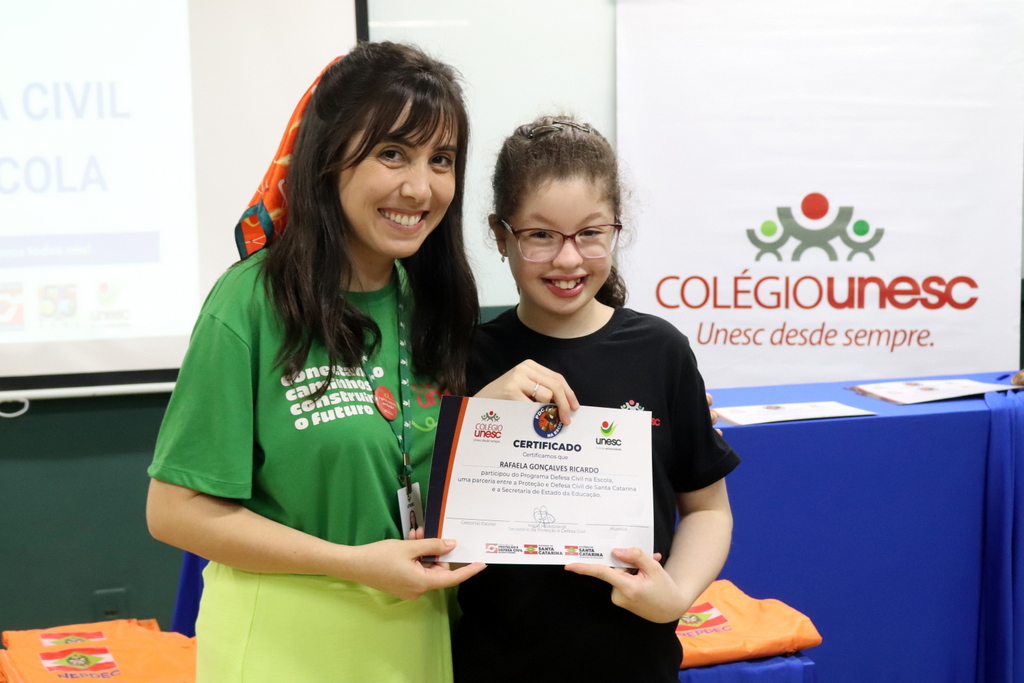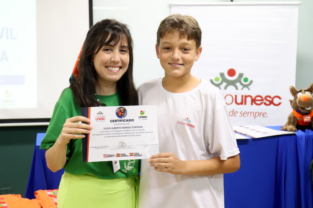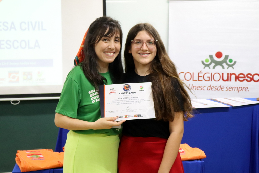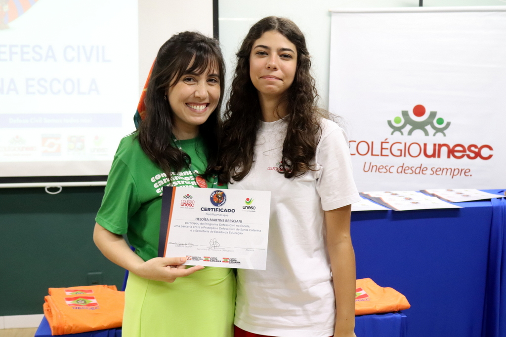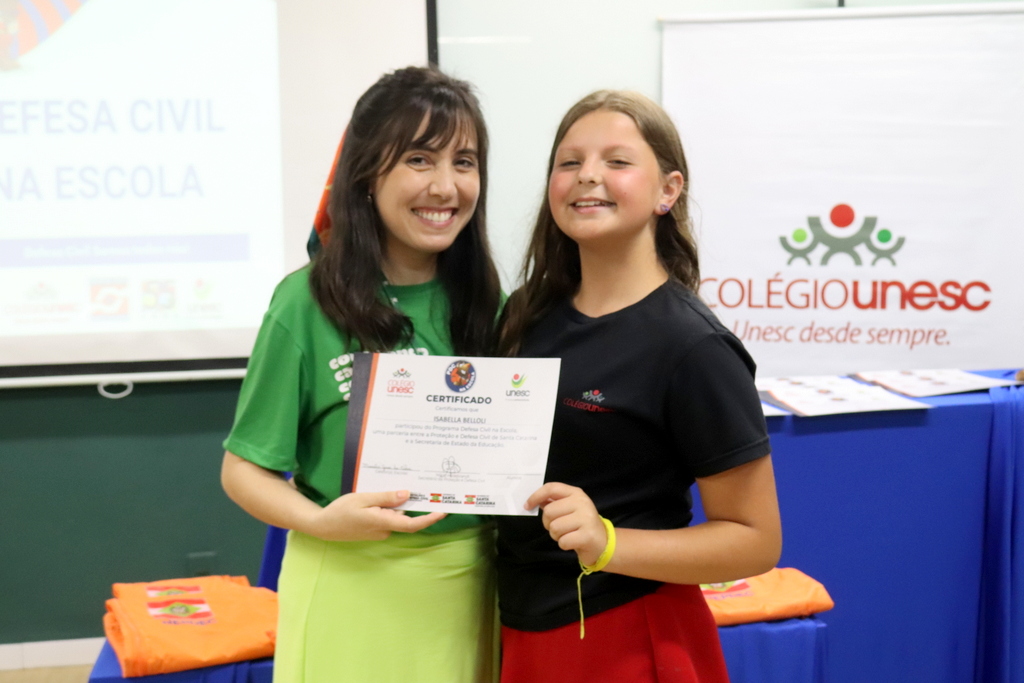 Na manhã desta quarta-feira (3/12), alunos do 6º ano do Colégio Unesc participaram da formatura do programa Defesa Civil na Escola, em cerimônia realizada na Instituição. O programa trabalha com turmas do Ensino Fundamental – Anos Finais, com foco no ensino, na aprendizagem, na participação e na criatividade. A proposta da Defesa Civil de Santa Catarina busca ampliar a resiliência das comunidades frente a eventos adversos.