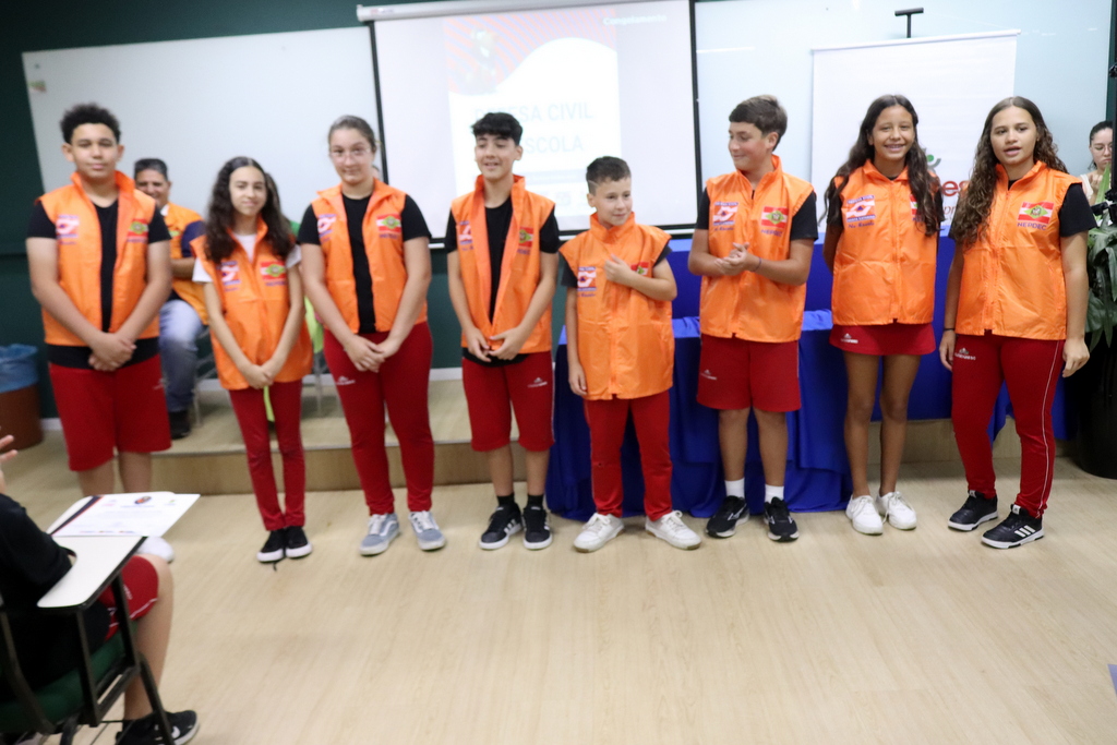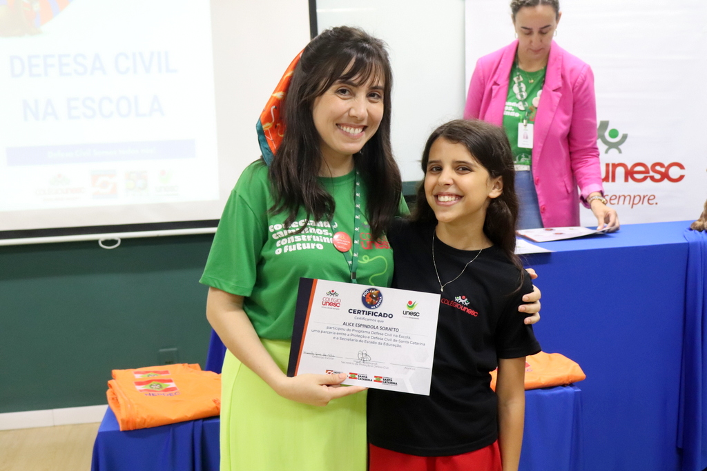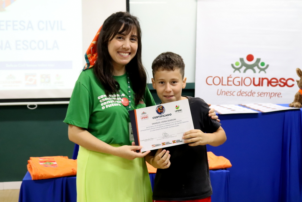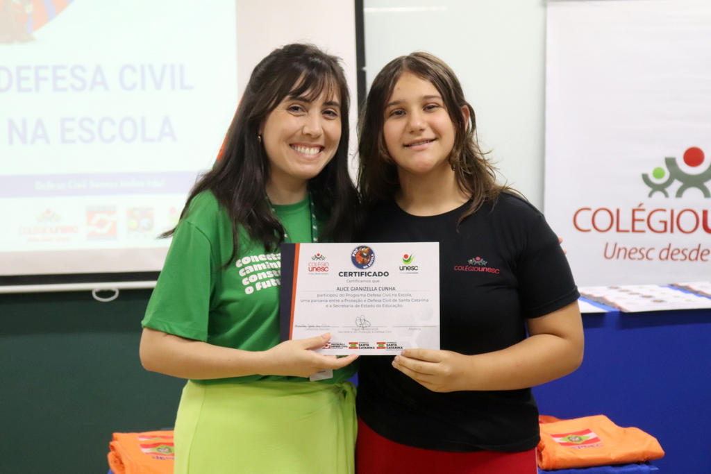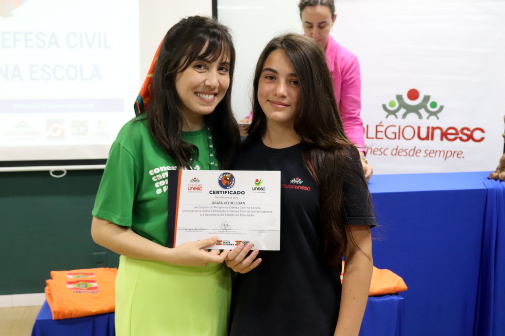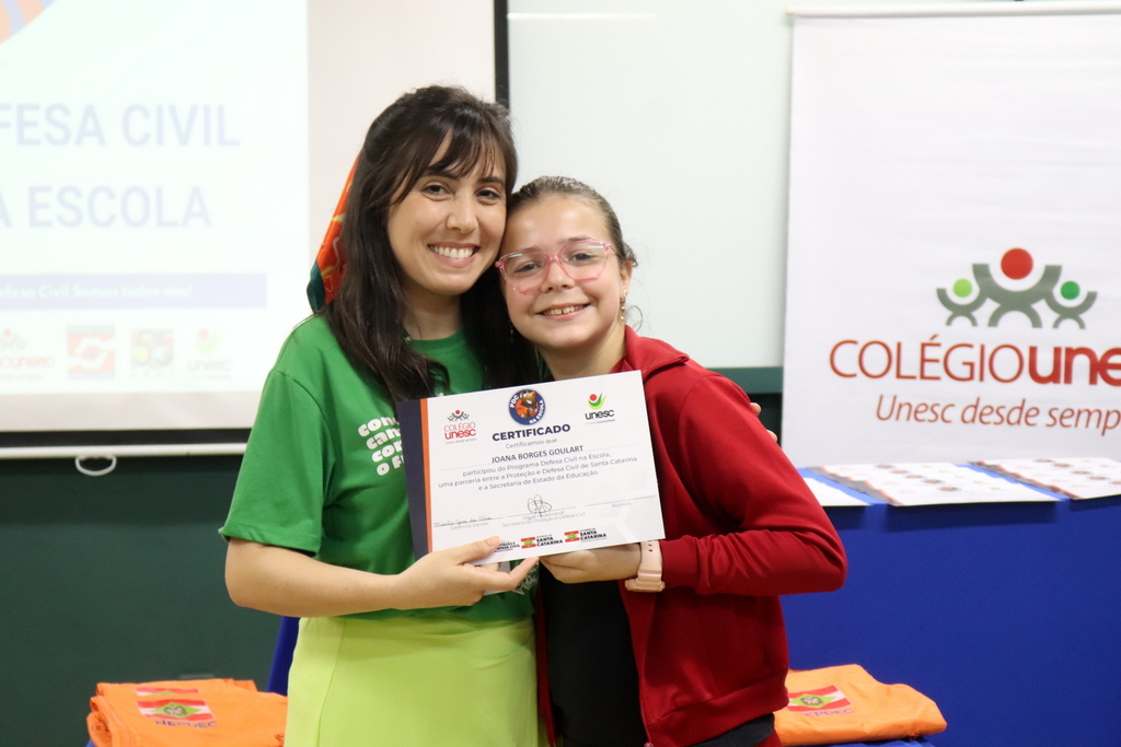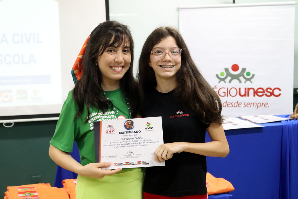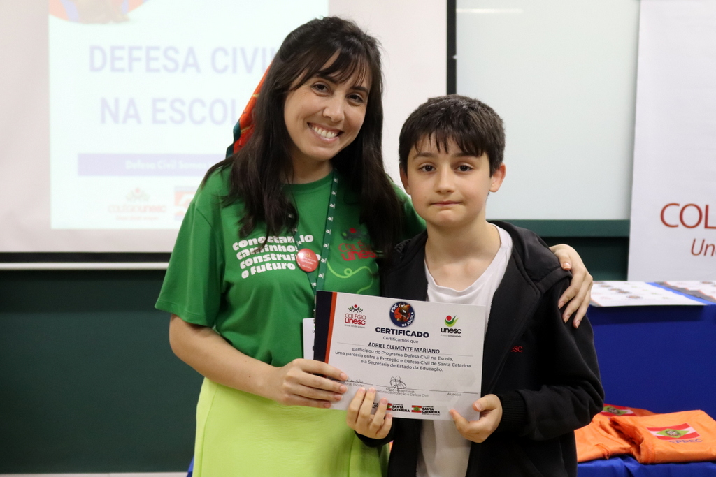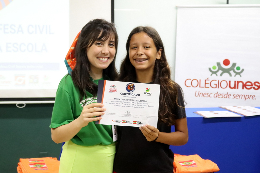 Na manhã desta quarta-feira (3/12), alunos do 6º ano do Colégio Unesc participaram da formatura do programa Defesa Civil na Escola, em cerimônia realizada na Instituição. O programa trabalha com turmas do Ensino Fundamental – Anos Finais, com foco no ensino, na aprendizagem, na participação e na criatividade. A proposta da Defesa Civil de Santa Catarina busca ampliar a resiliência das comunidades frente a eventos adversos.