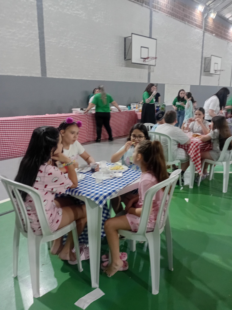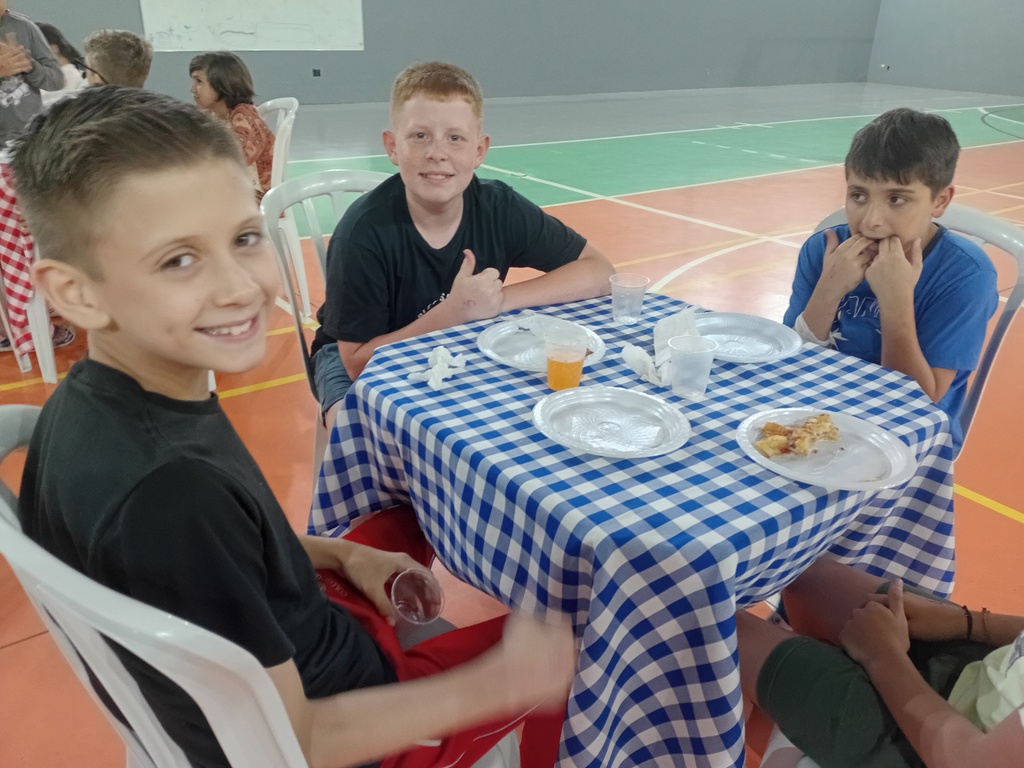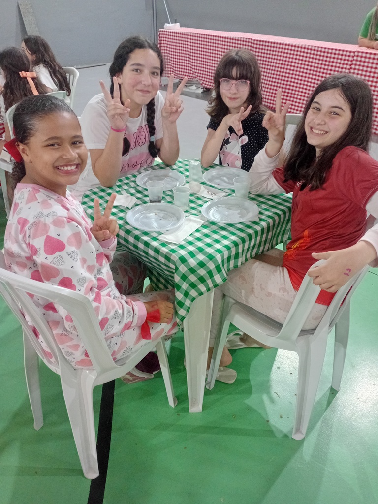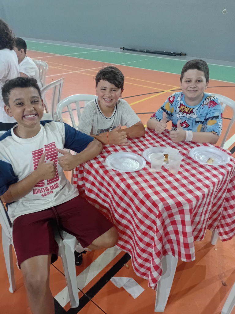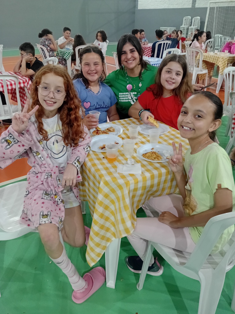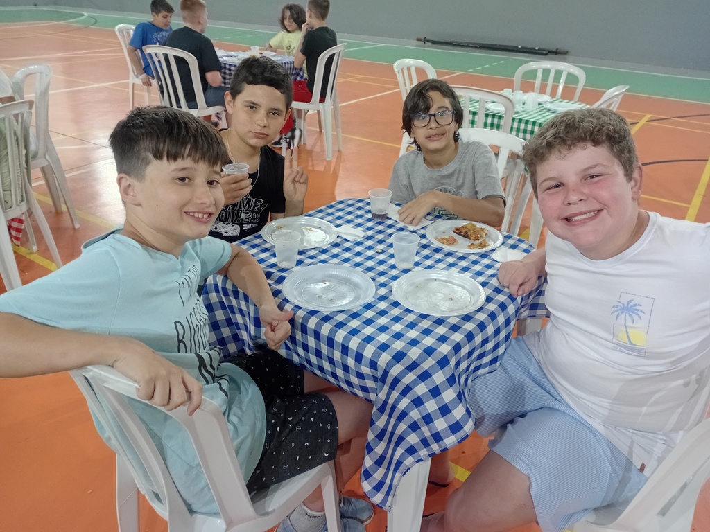 “Outro ponto alto da noite foi o jantar. O ginásio transformou-se em uma praça de alimentação, com rodízio de pizzas salgadas. Para muitos alunos, o momento ficou marcado como “o dia da pizza”, reforçando o caráter afetivo da vivência”, comenta Patrícia.