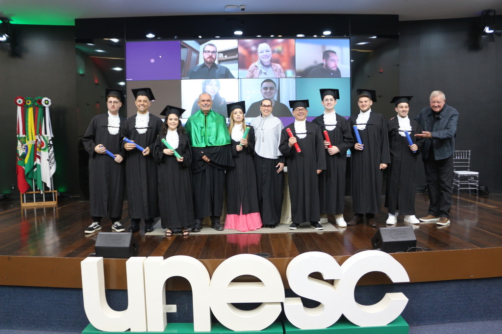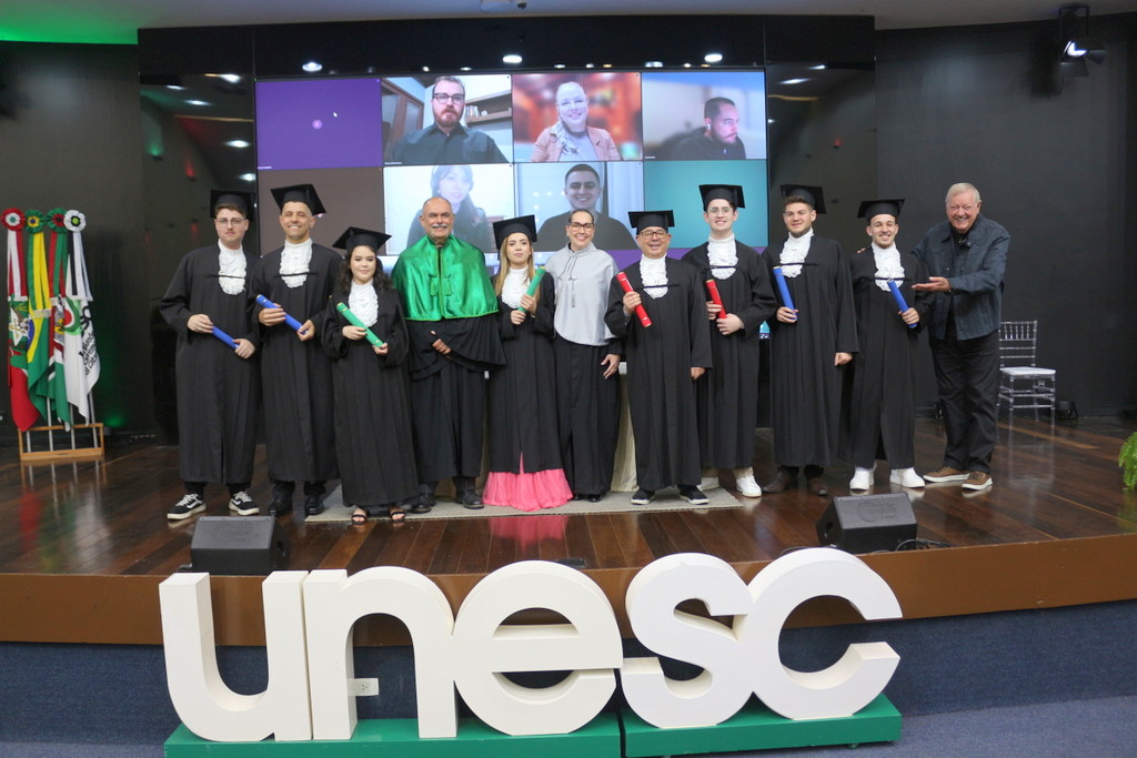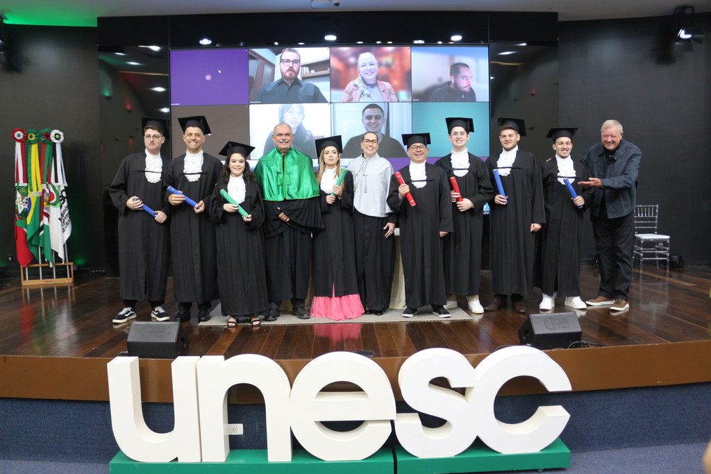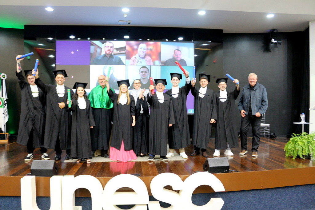 Uma noite para celebrar conquistas e encerrar ciclos com gratidão. Assim foi a quinta-feira (30/10) no Auditório Ruy Hülse, onde a Unesc realizou a colação de grau especial dos cursos de Tecnologia em Análise e Desenvolvimento de Sistemas; Comunicação Digital; Estética e Cosmética; Gastronomia e Gestão de Turismo, todos na modalidade de Ensino a Distância (EaD).