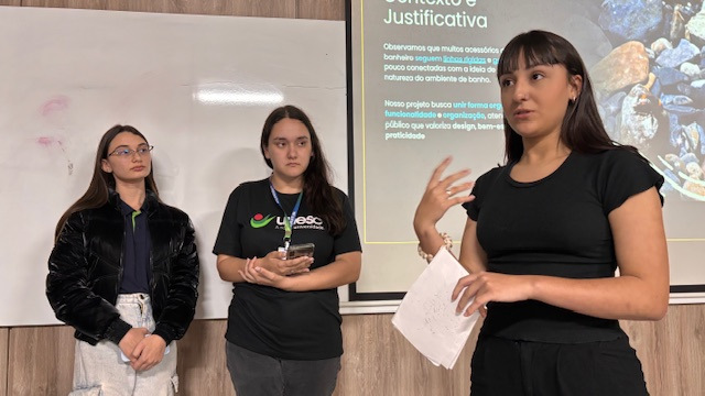 Acadêmicos da 4ª fase do Curso de Design da Unesc apresentaram projetos de design de superfícies para as empresas Dexco e Torrecid na última segunda-feira (15/12). Na terça-feira (16/12), foi a vez dos estudantes da 2ª fase mostrarem oito propostas de metais sanitários para a Deca, também do Grupo Dexco. As apresentações marcaram o encerramento de um semestre de parceria direta entre a Universidade e a indústria, com profissionais das empresas avaliando os trabalhos desenvolvidos a partir de briefings reais.