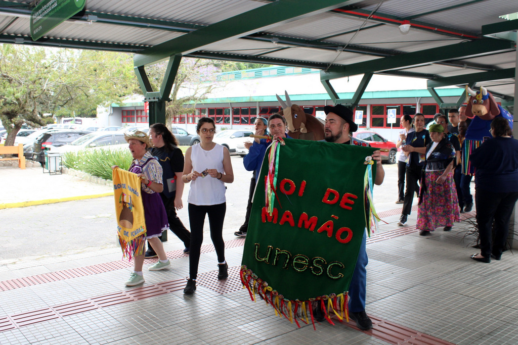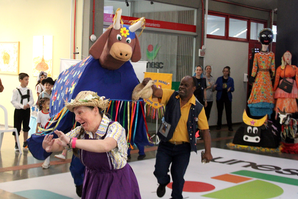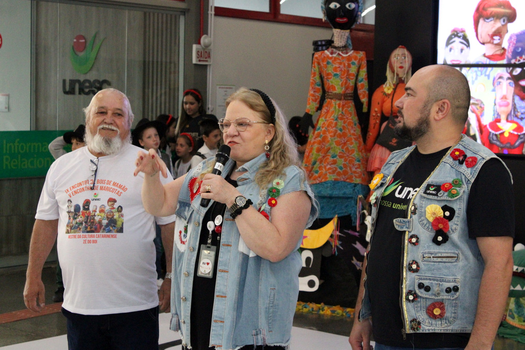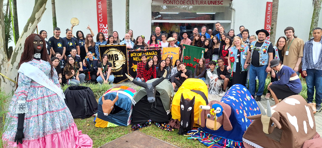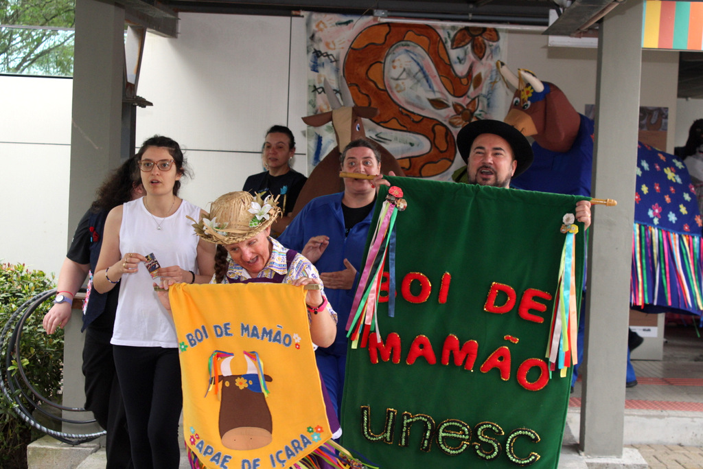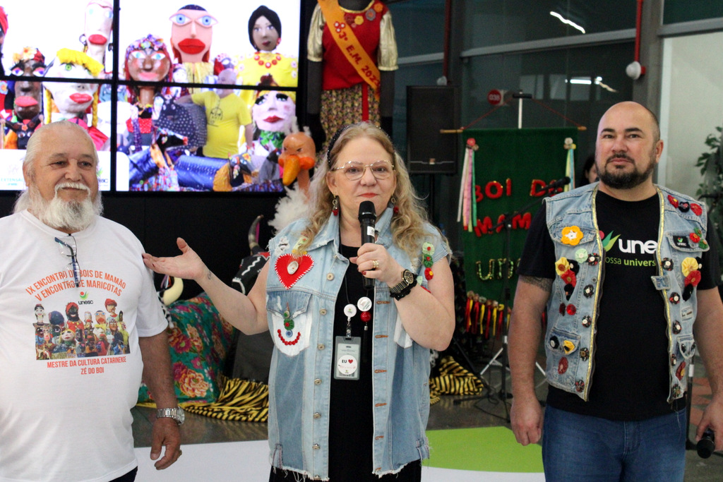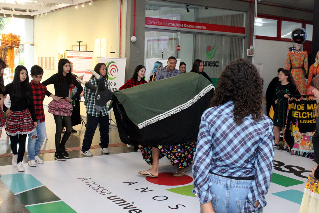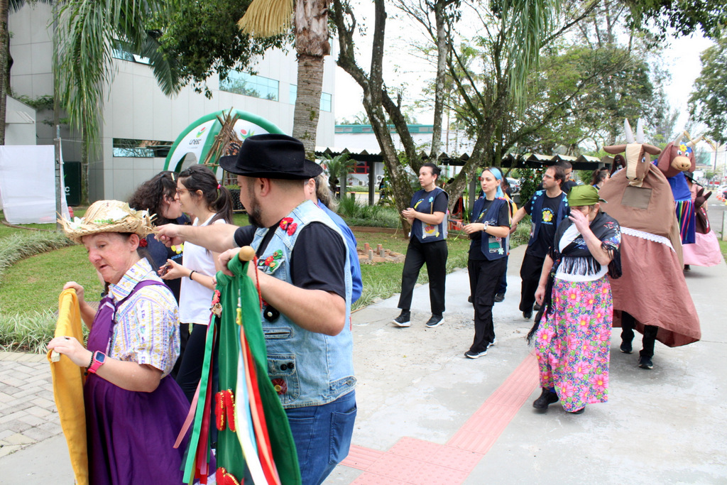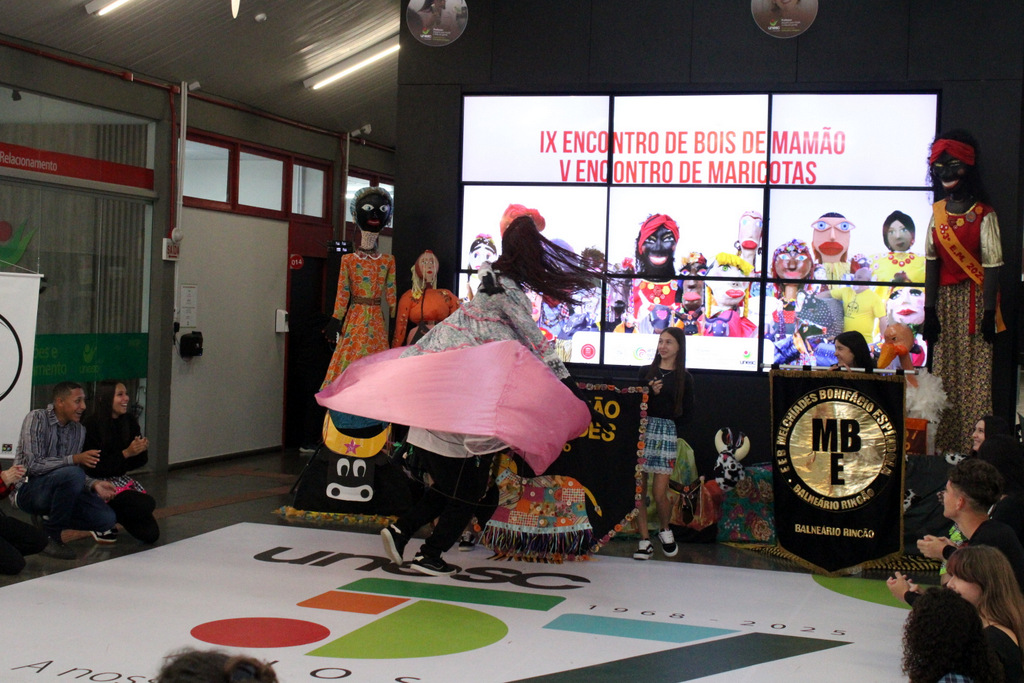 A coordenadora do Setor de Arte e Cultura, Amalhene Baesso Reddig, a Lenita, lembrou que a Unesc é um ponto de cultura do Ministério da Cultura, da Rede Cultura Viva. “Realizar o intercâmbio cultural entre os participantes da cultura popular catarinense – boi de mamão – tem como foco o fortalecimento dessa tradição. Hoje, é o Dia Internacional do Patrimônio Cultural Imaterial e celebramos coletivamente as tradições vivas que definem nessas histórias, memórias, saberes por meio da educação, da colaboração e da conscientização do valor dos que nos antecederam. A interação que provamos no campus Unesc reverbera na região e contribui para a cultura de paz e tolerância”, enfatizou ela.