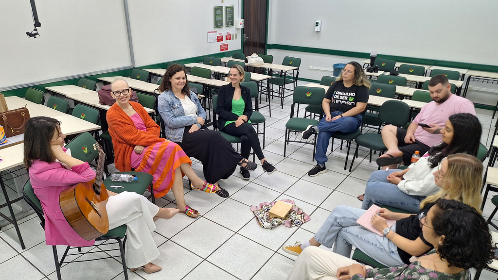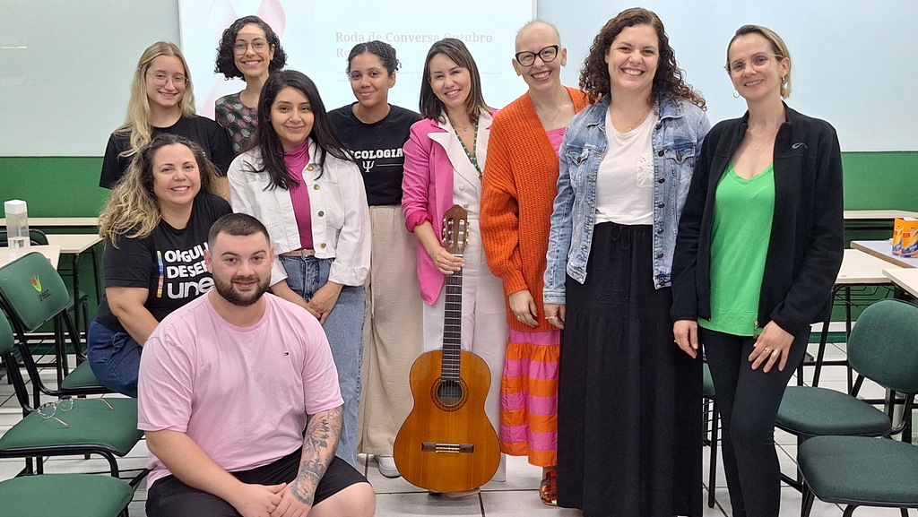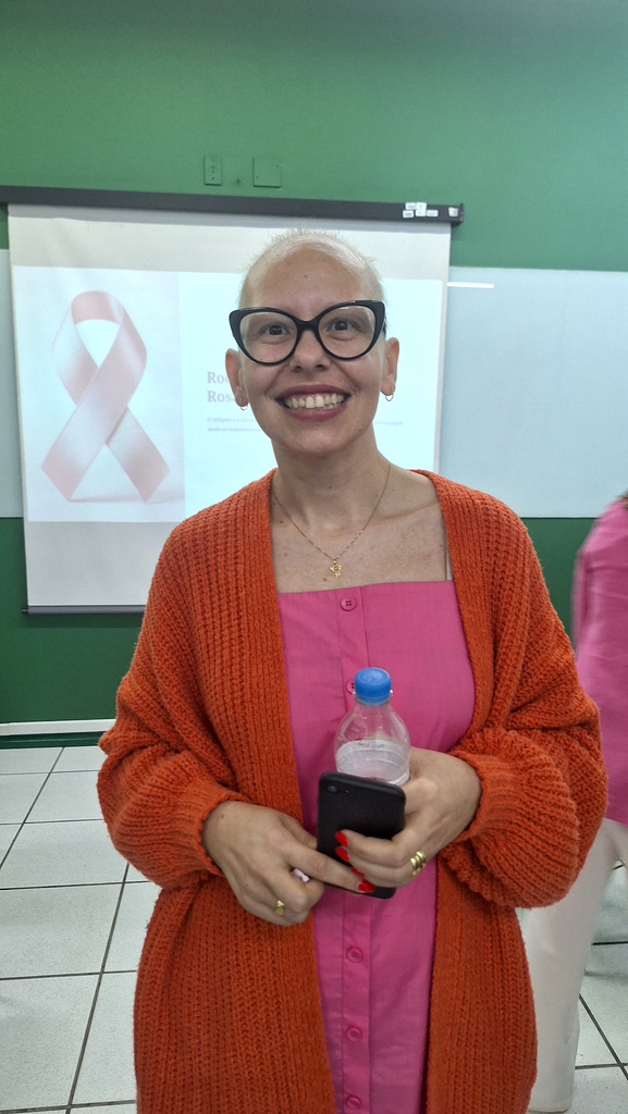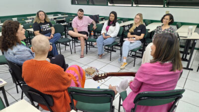 Por meio de terapia musical, a professora mediou o bate-papo com o grupo que se reuniu para buscar informações e apoio. “A roda de conversa foi importante para que pudéssemos falar para além da prevenção do Câncer de Mama neste Outubro Rosa, pensando também no cuidado com quem está realizando o tratamento. Falamos sobre alguns tabus, sobre o silêncio e a angústia de não buscar ajuda ou de não saber onde ter acesso.A proposta de hoje foi justamente de construirmos essa ideia de como ir buscar esse cuidado, rompendo com o silêncio que está na alma, que precisa falar, que precisa traduzir, compartilhar enquanto está vivenciando um momento que é tão desafiador como o tratamento oncológico”, pontuou a professora.