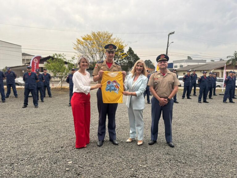A Unesc realizou, na tarde desta quinta-feira (16/10), a entrega de mil camisetas ao Programa Golfinho, durante a cerimônia que celebrou os 53 anos do 4º Batalhão de Bombeiros Militar (BBM) de Criciúma. O ato contou com a presença da reitora em exercício, Gisele Silveira Coelho Lopes, e da secretária de Estado da Educação, Luciane Bisognin Ceretta, bem como de diversas outras autoridades.