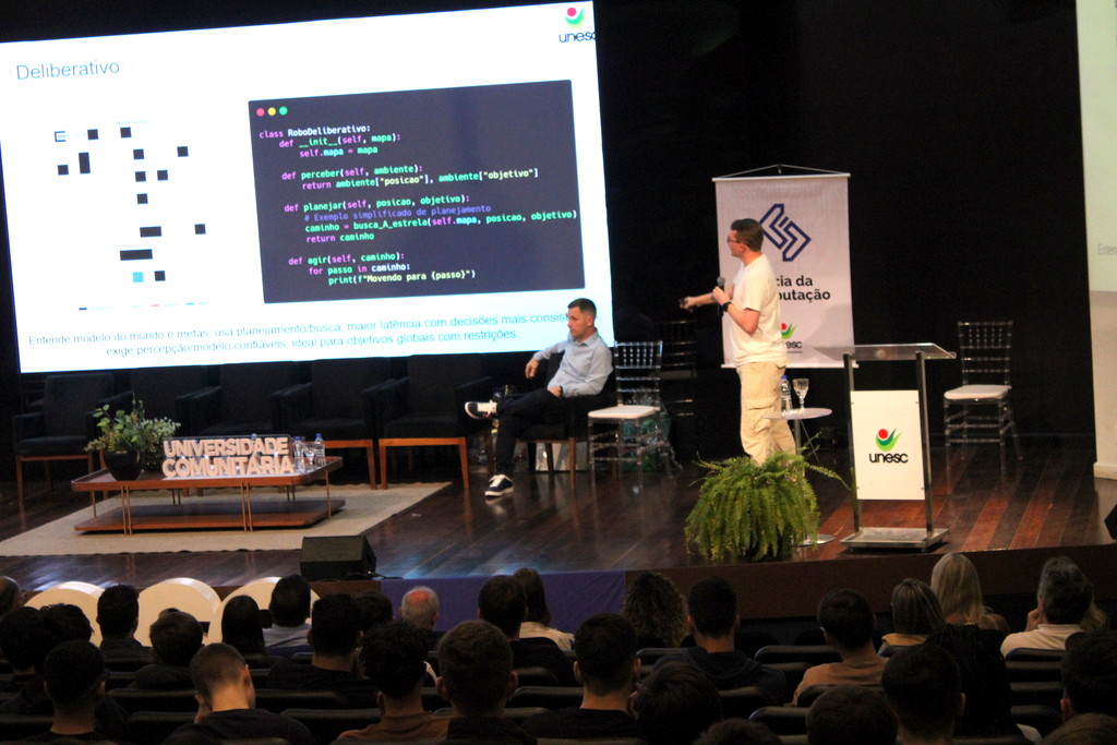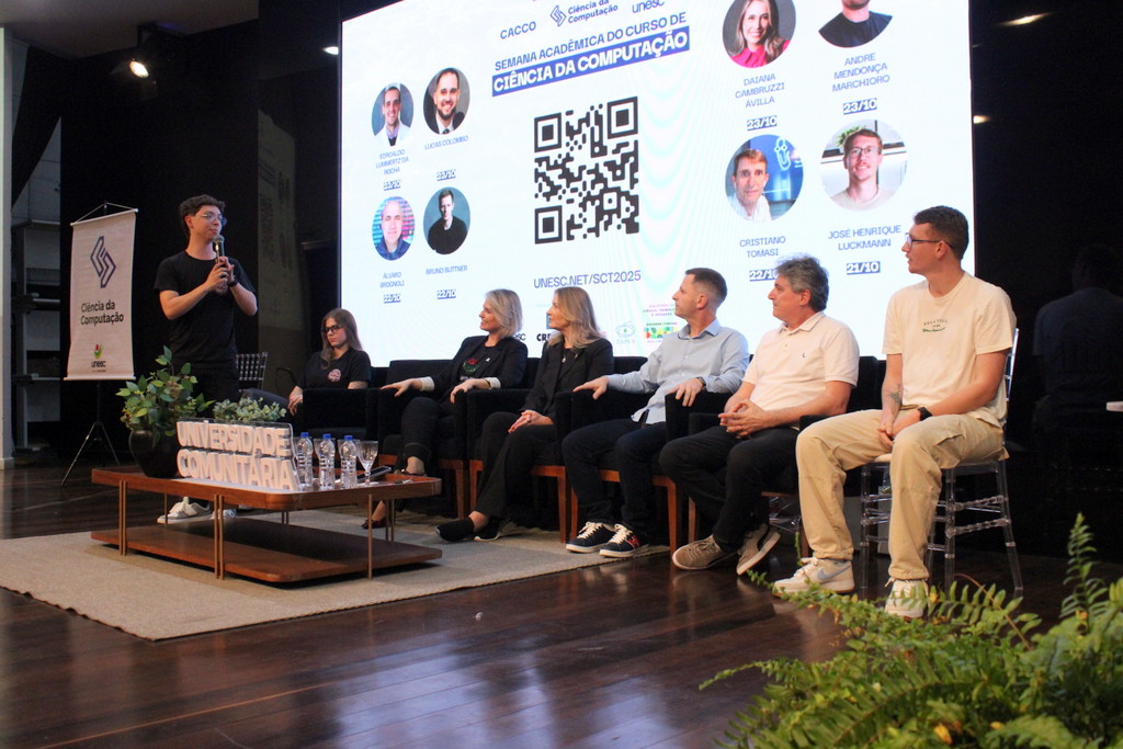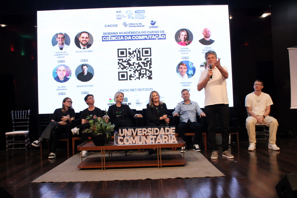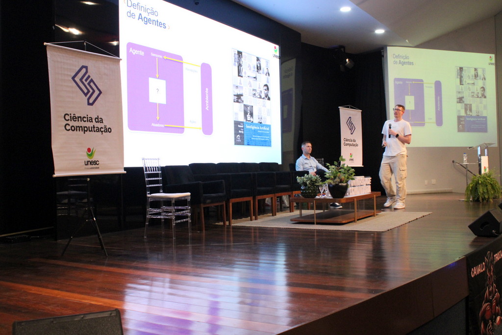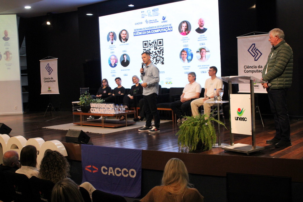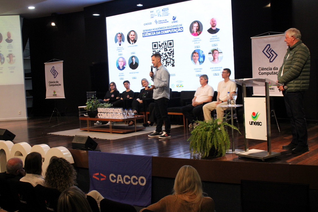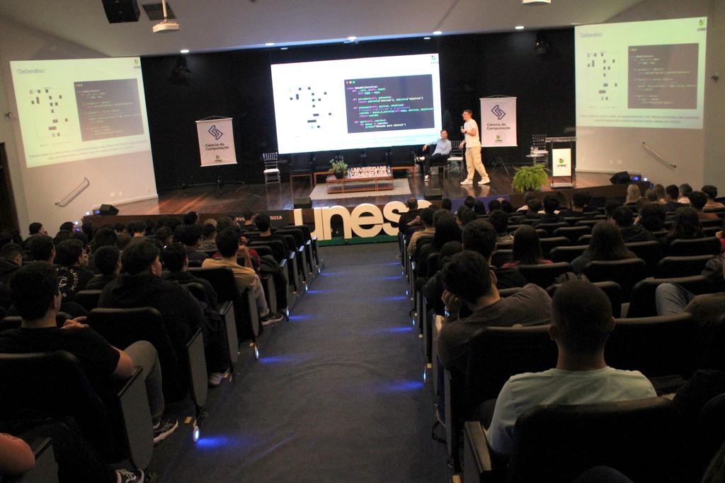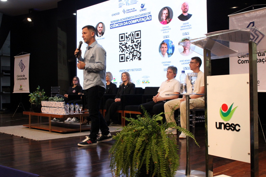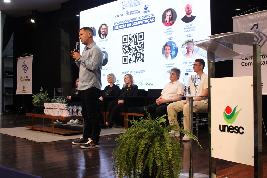 A tecnologia, os vínculos humanos e o compromisso com a formação integral marcaram a abertura da Semana Acadêmica do curso de Ciência da Computação da Unesc, realizada na noite desta terça-feira (21/10). Integrando a 16ª Semana de Ciência e Tecnologia (SCT) da Universidade, o evento teve como palestra de abertura o tema “Agentes Inteligentes”, conduzido pelo cientista de dados José Henrique Luckmann, especialista em desenvolvimento de algoritmos e computação em nuvem.