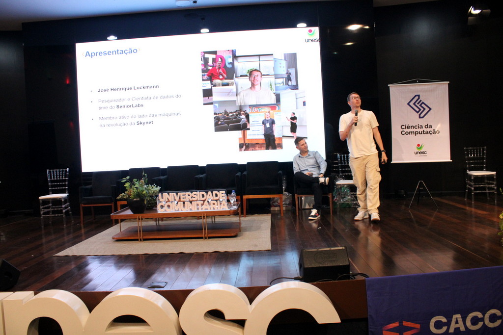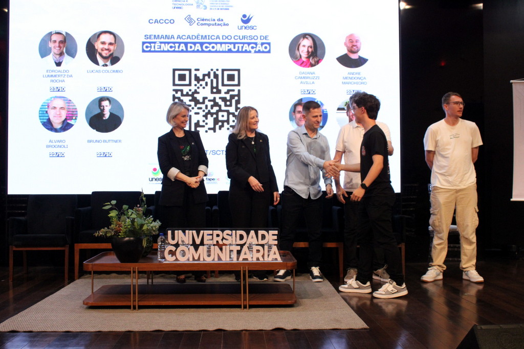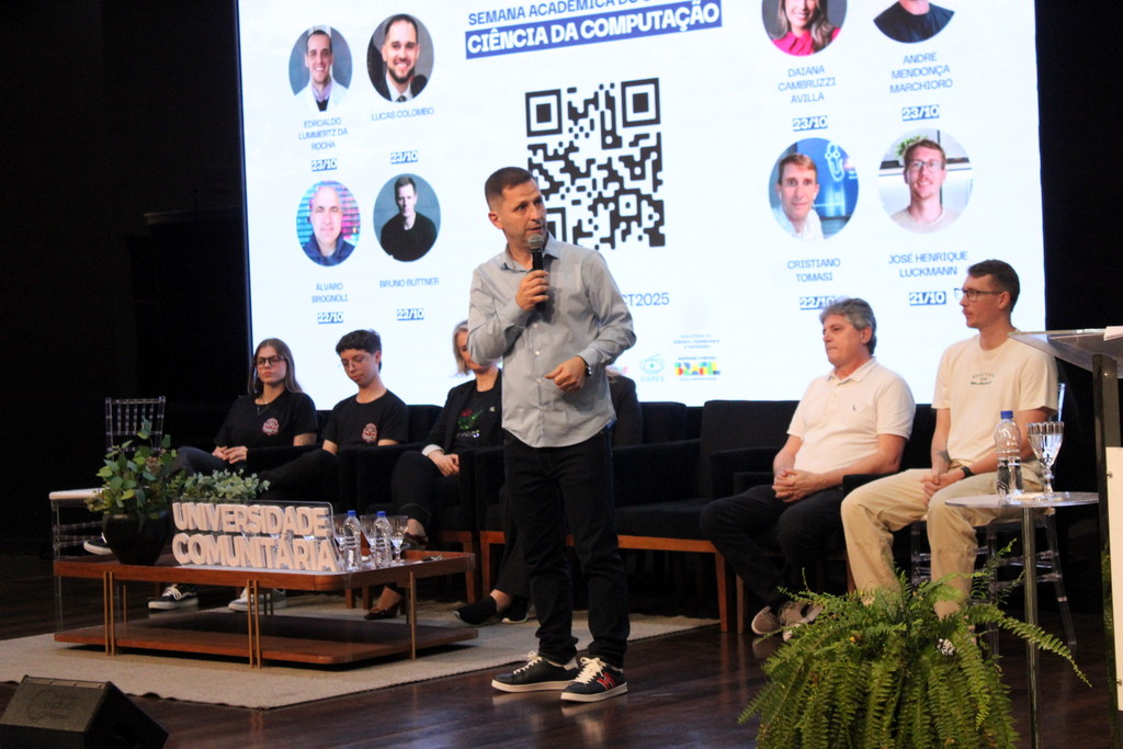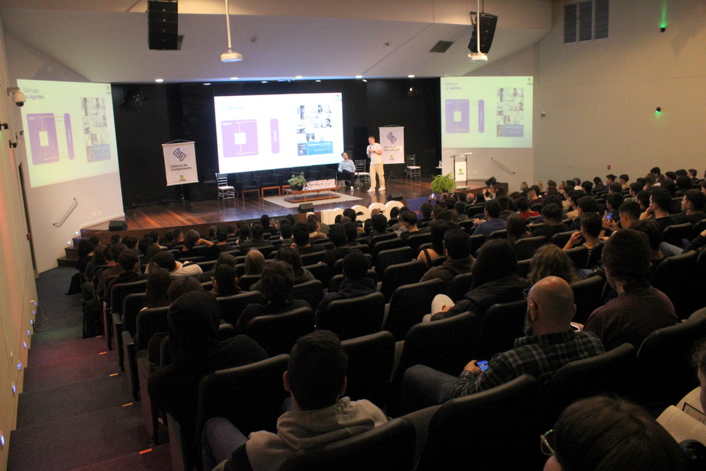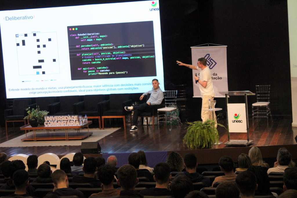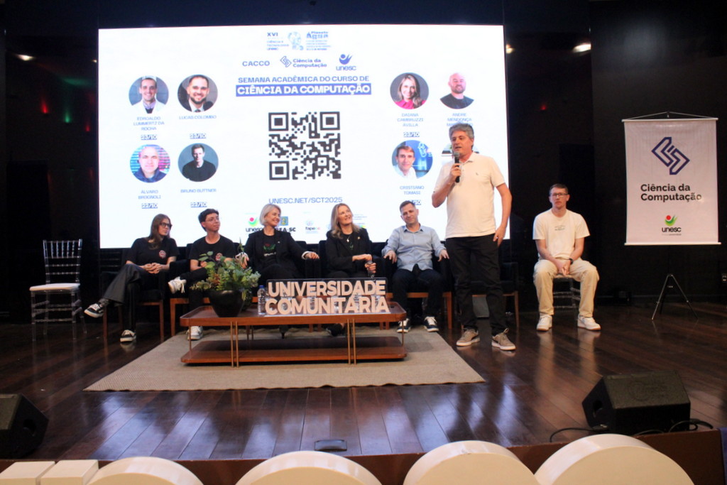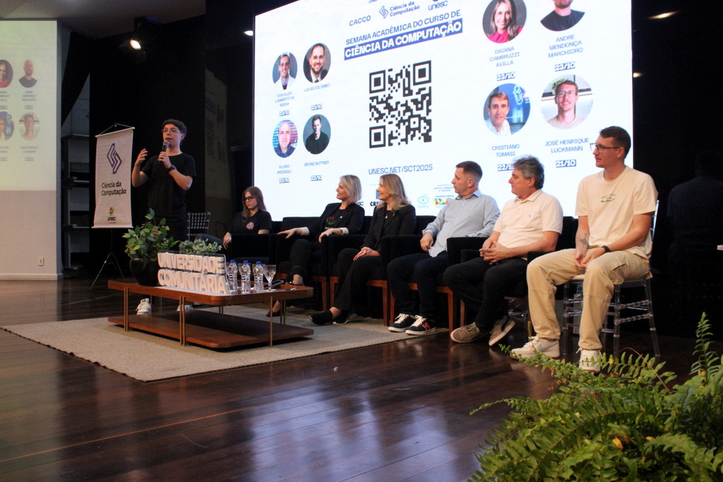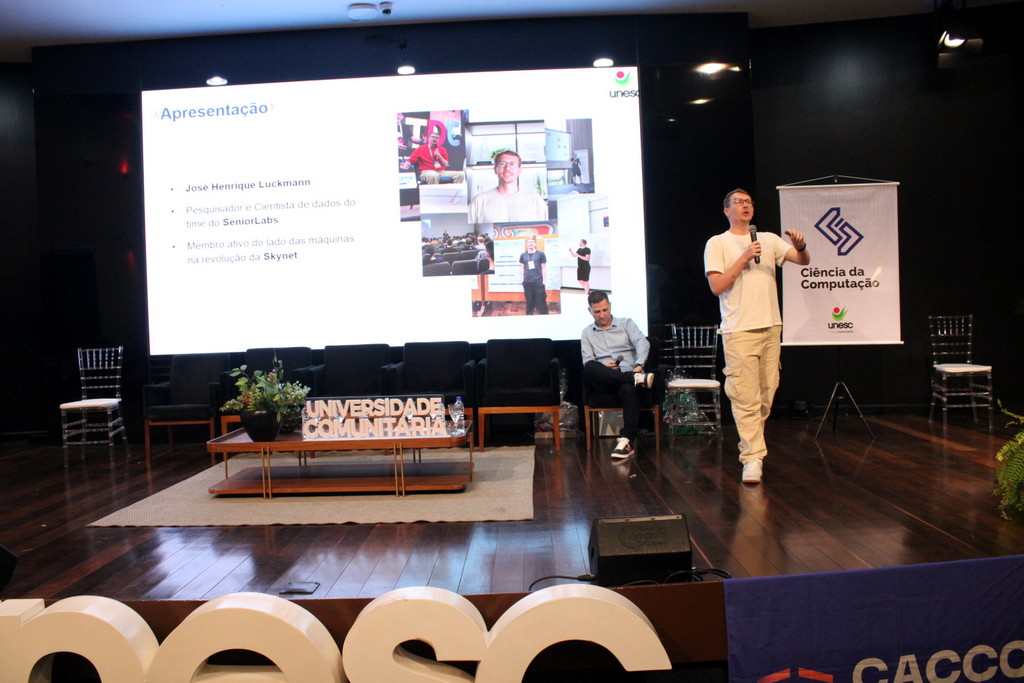 A tecnologia, os vínculos humanos e o compromisso com a formação integral marcaram a abertura da Semana Acadêmica do curso de Ciência da Computação da Unesc, realizada na noite desta terça-feira (21/10). Integrando a 16ª Semana de Ciência e Tecnologia (SCT) da Universidade, o evento teve como palestra de abertura o tema “Agentes Inteligentes”, conduzido pelo cientista de dados José Henrique Luckmann, especialista em desenvolvimento de algoritmos e computação em nuvem.