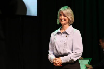 A reitora em exercício da Unesc, Gisele Silveira Coelho Lopes, foi homenageada na Sessão Solene da Câmara de Vereadores de Criciúma com o Título Honorífico de Cidadania Benemérita, entregue nesta quarta-feira (3/12), no Teatro Elias Angeloni. A iniciativa foi proposta pelo vereador Juarez de Jesus, em reconhecimento aos relevantes serviços prestados ao município, e aprovada por unanimidade pelos parlamentares.