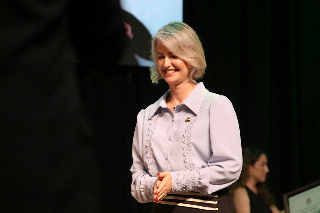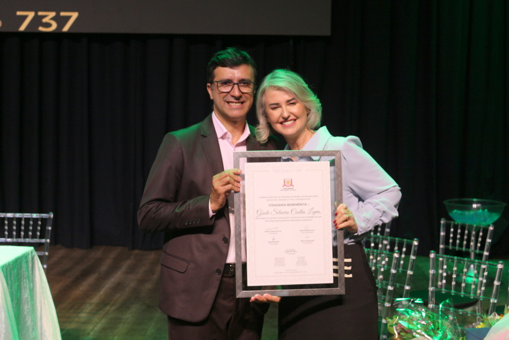 A reitora em exercício da Unesc, Gisele Silveira Coelho Lopes, foi homenageada na Sessão Solene da Câmara de Vereadores de Criciúma com o Título Honorífico de Cidadania Benemérita, entregue nesta quarta-feira (3/12), no Teatro Elias Angeloni. A iniciativa foi proposta pelo vereador Juarez de Jesus, em reconhecimento aos relevantes serviços prestados ao município, e aprovada por unanimidade pelos parlamentares.