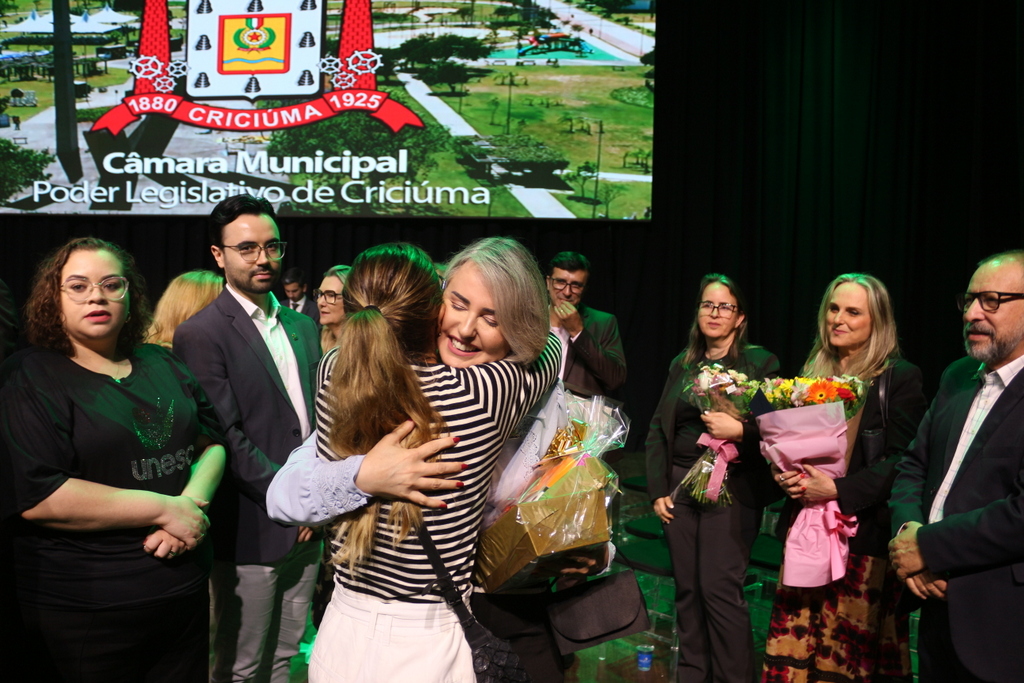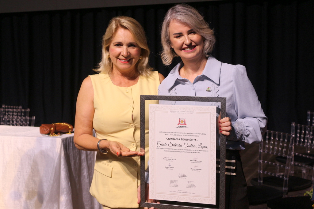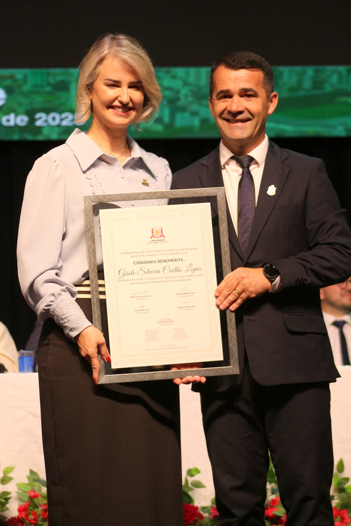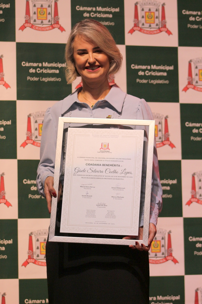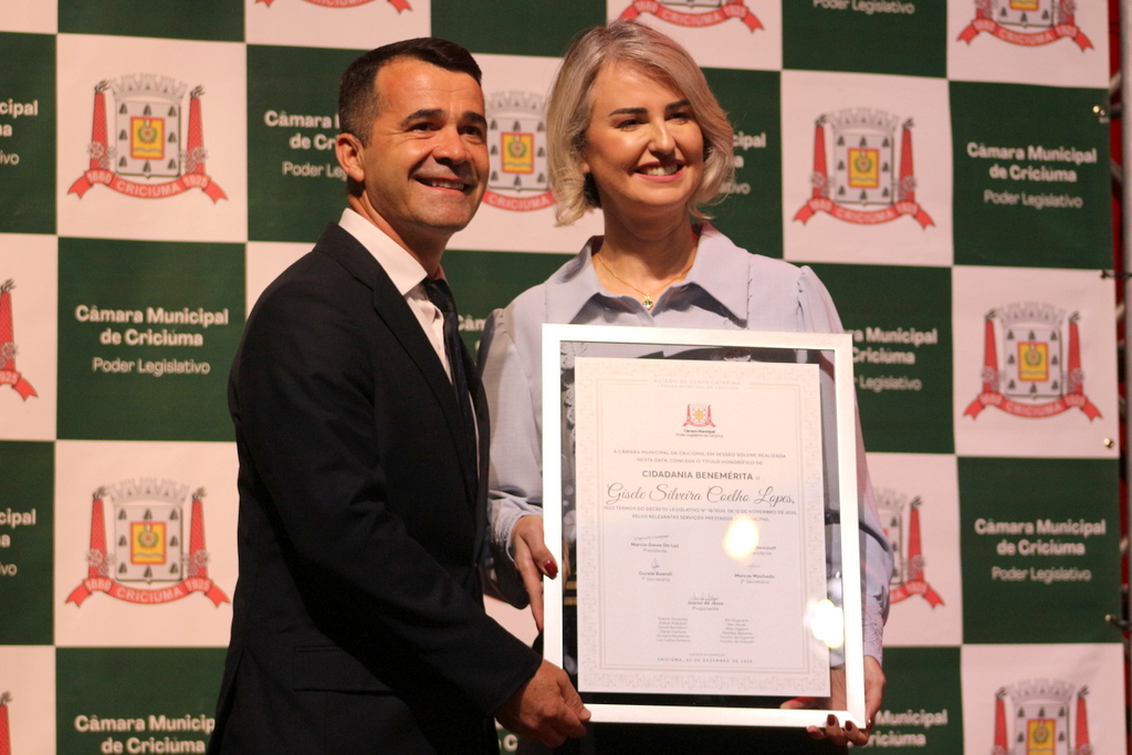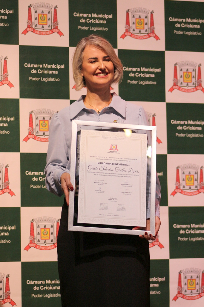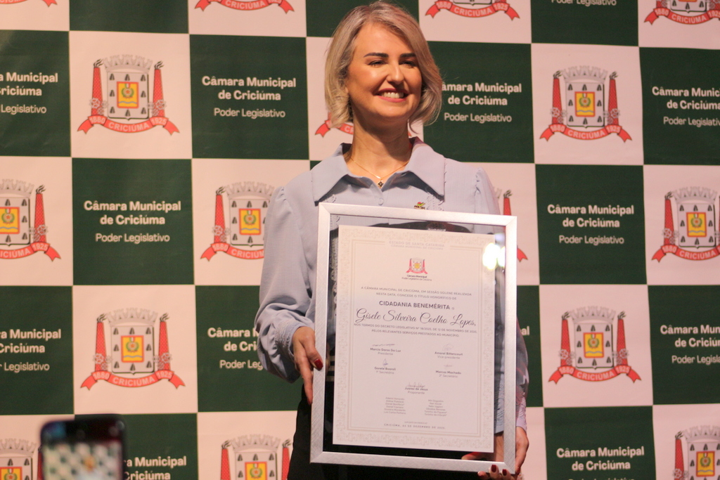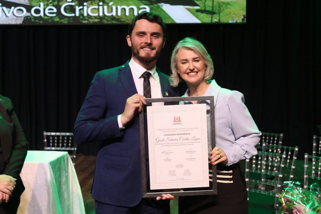 “Recebo este título com gratidão e com um compromisso ainda maior de seguir contribuindo com uma Criciúma plural, inovadora e acolhedora”, complementou ela.