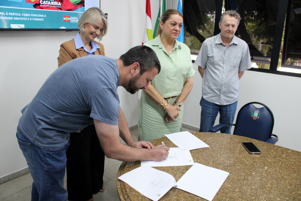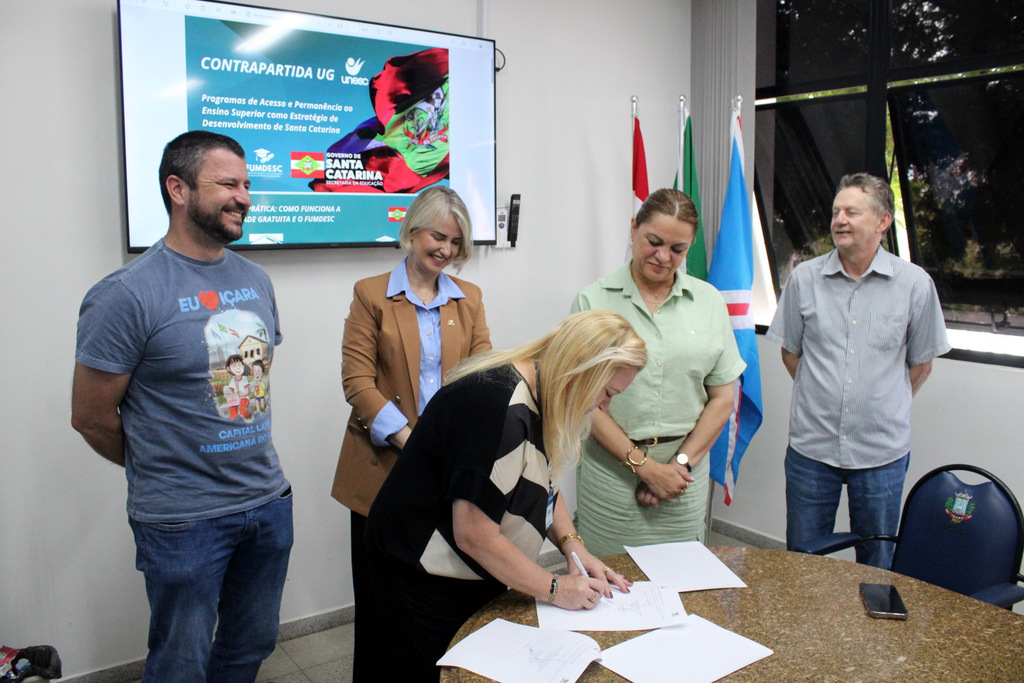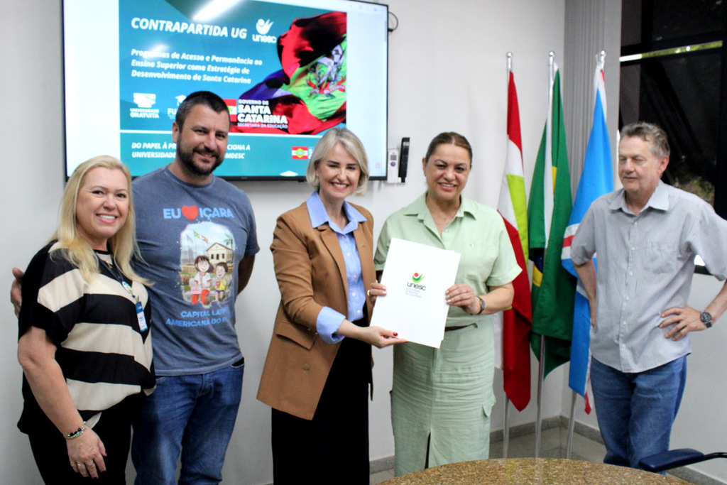 A Unesc e a Prefeitura de Içara oficializaram, na manhã desta quarta-feira (17/12), a assinatura do termo de cooperação técnica que viabiliza a atuação de egressos da Universidade beneficiados pelo Programa Universidade Gratuita (UG) no município. A iniciativa integra uma política pública do Governo do Estado de Santa Catarina, por meio da Secretaria de Estado da Educação, e reforça o compromisso com a transformação social e o desenvolvimento regional.