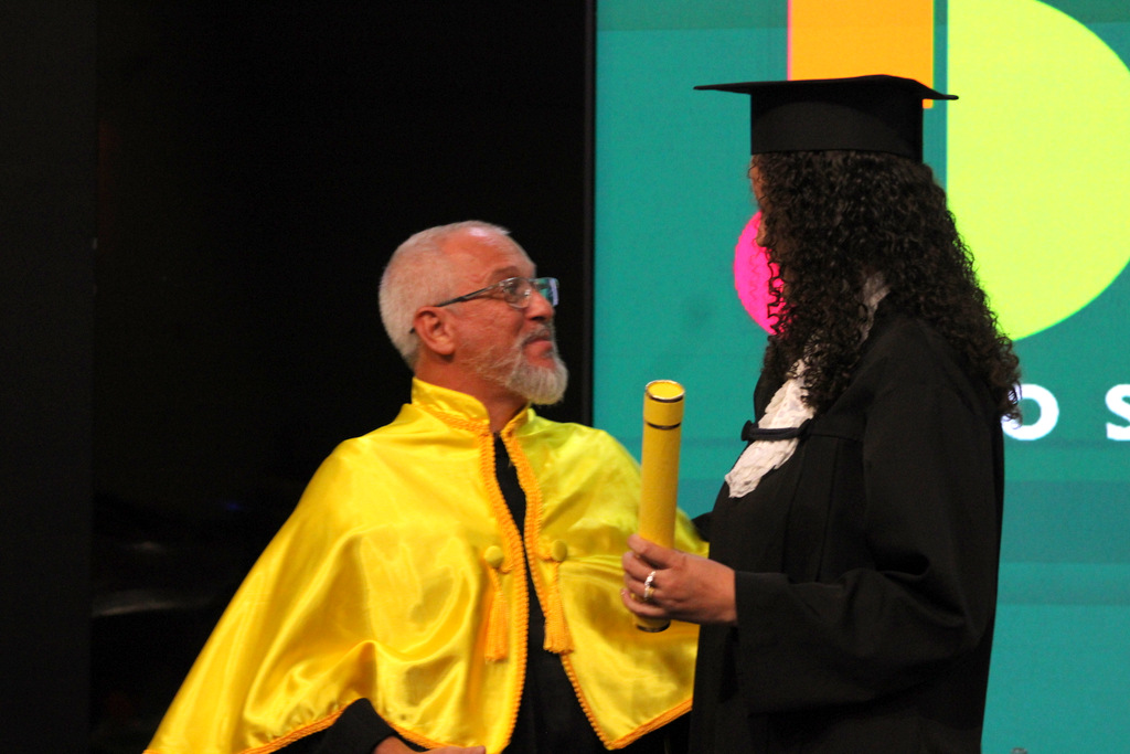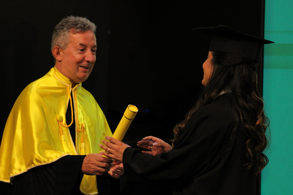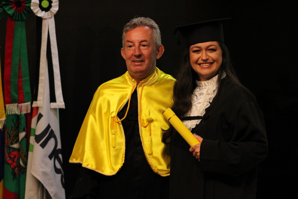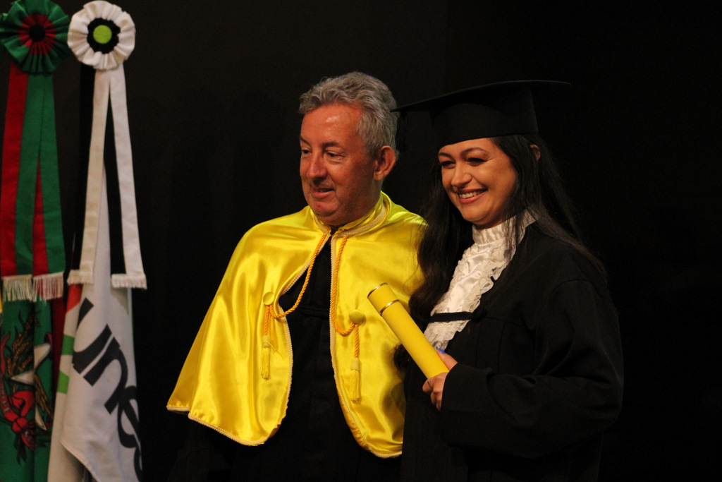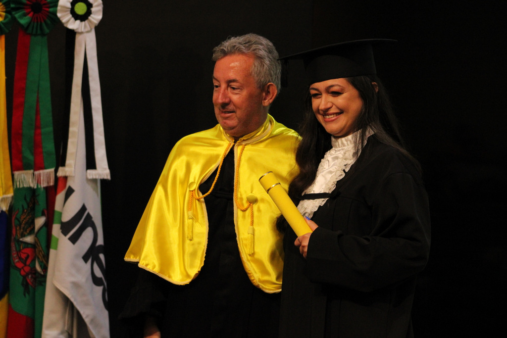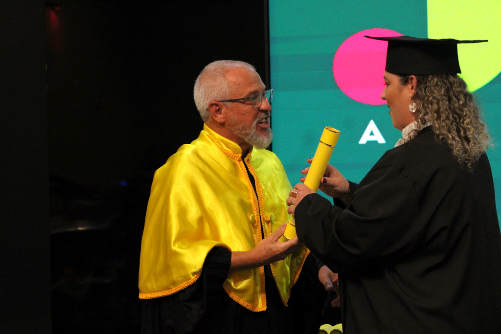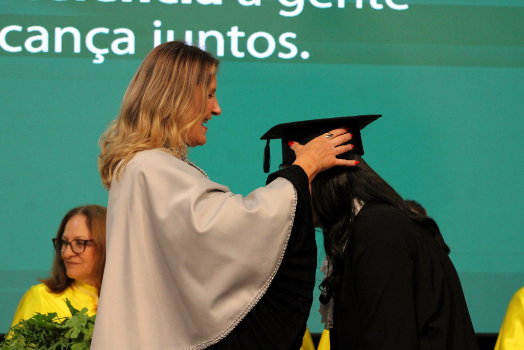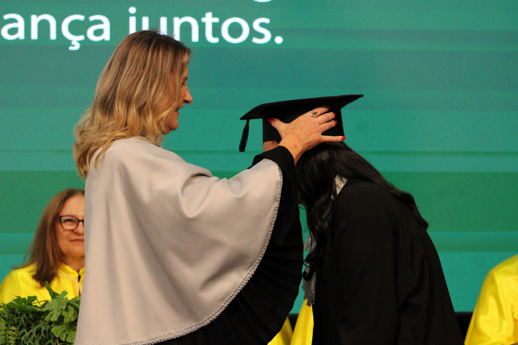 Após a outorga coletiva de grau, foi realizada a imposição dos capelos pela pró-reitora e a entrega individual dos certificados pelos coordenadores de cada curso.