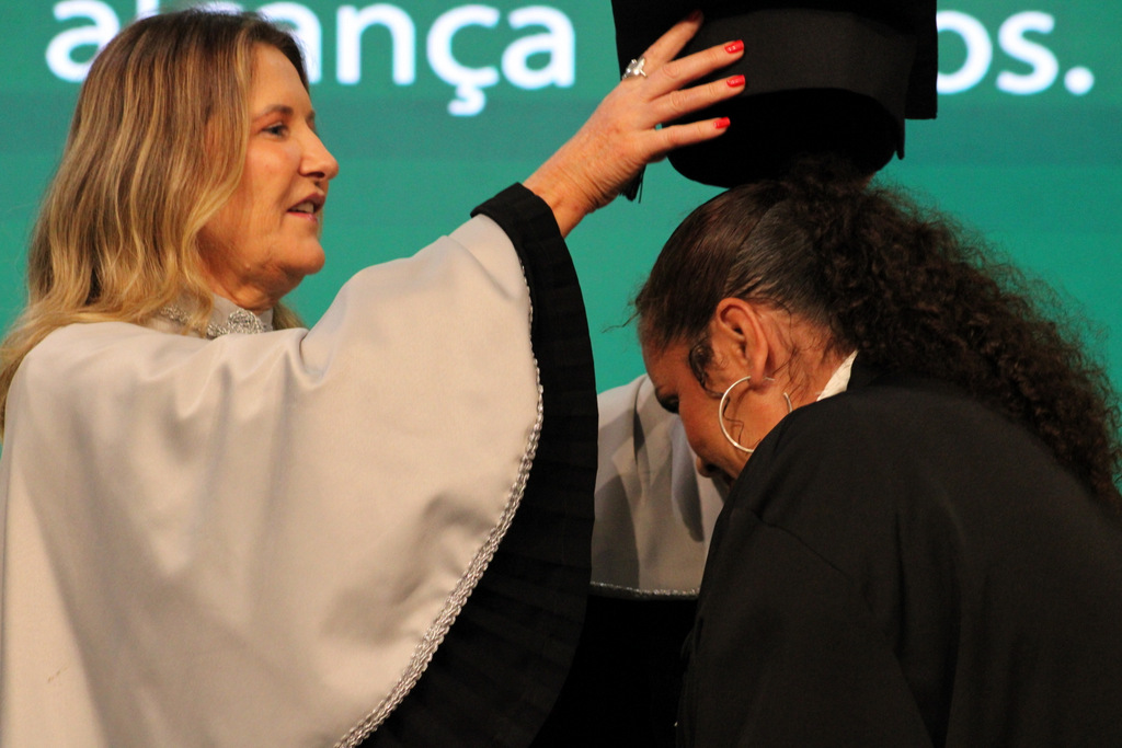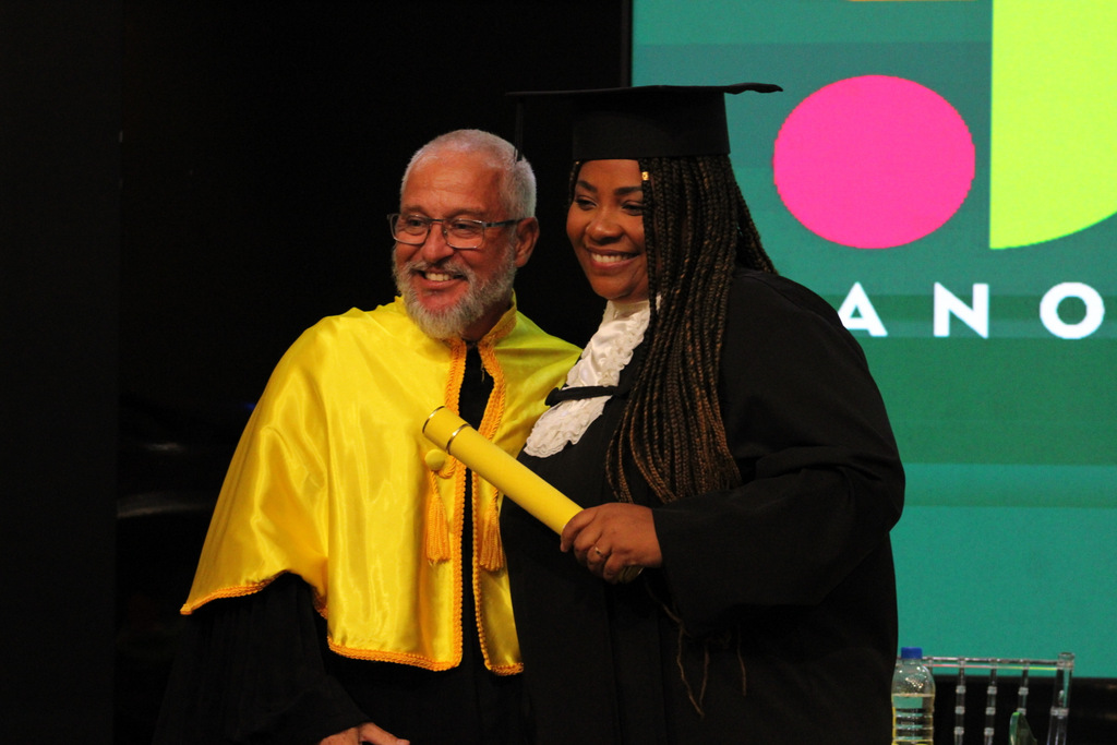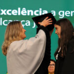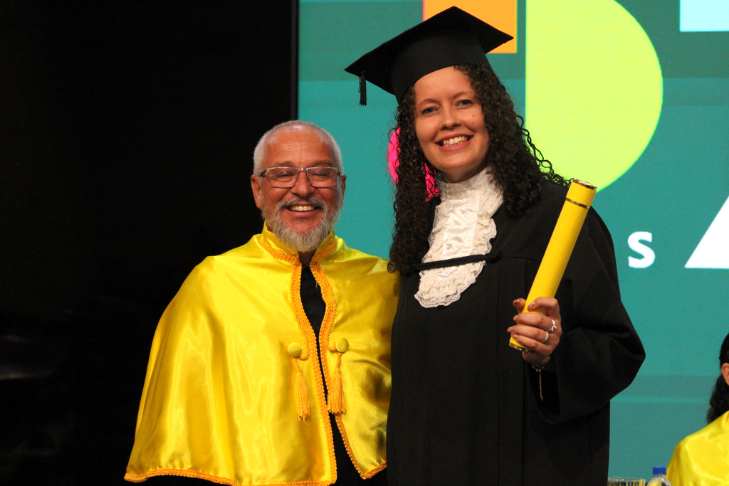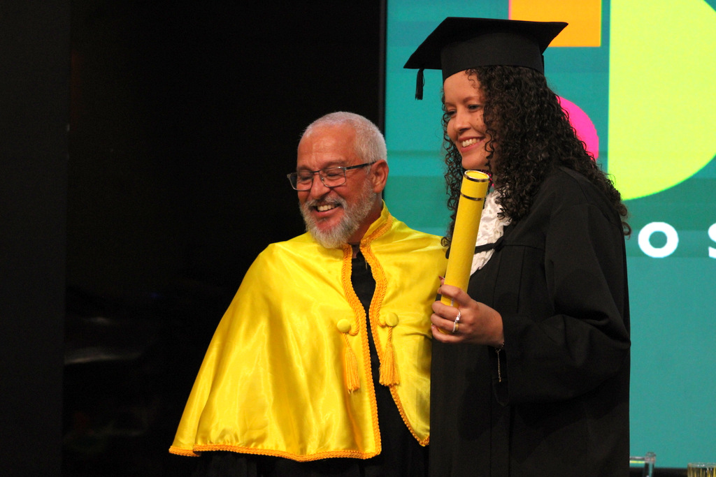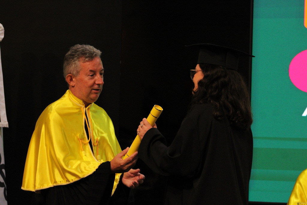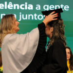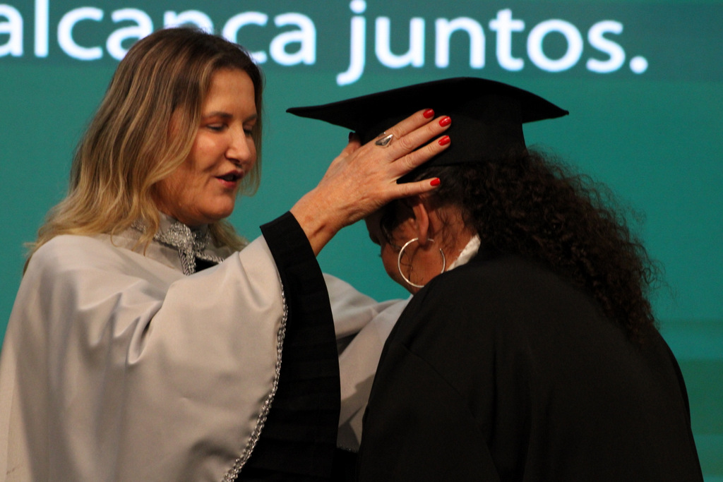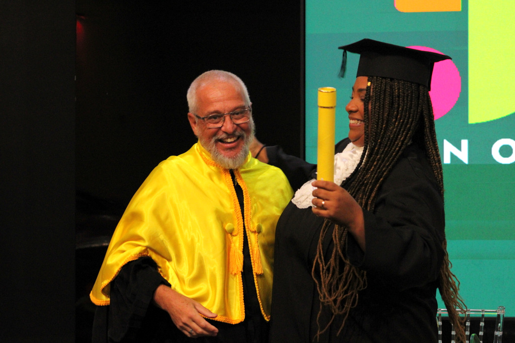Após a outorga coletiva de grau, foi realizada a imposição dos capelos pela pró-reitora e a entrega individual dos certificados pelos coordenadores de cada curso.