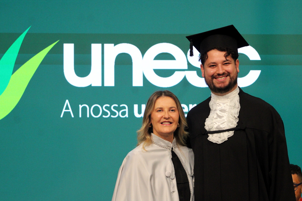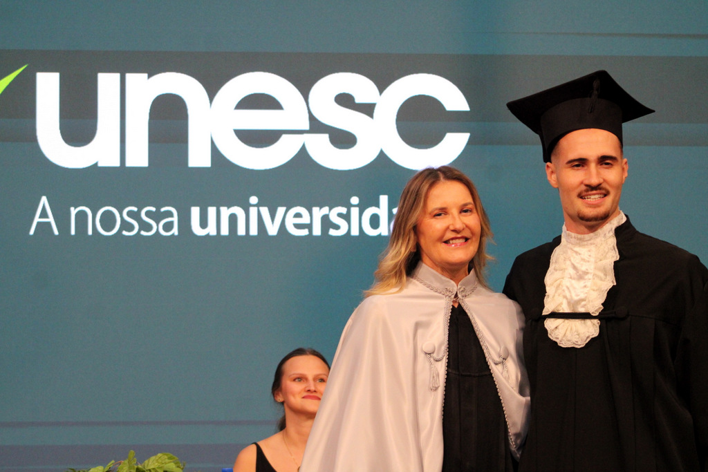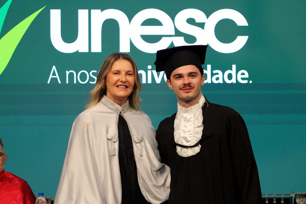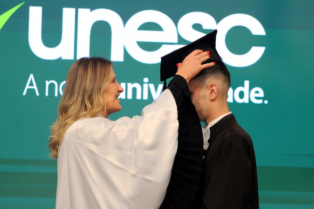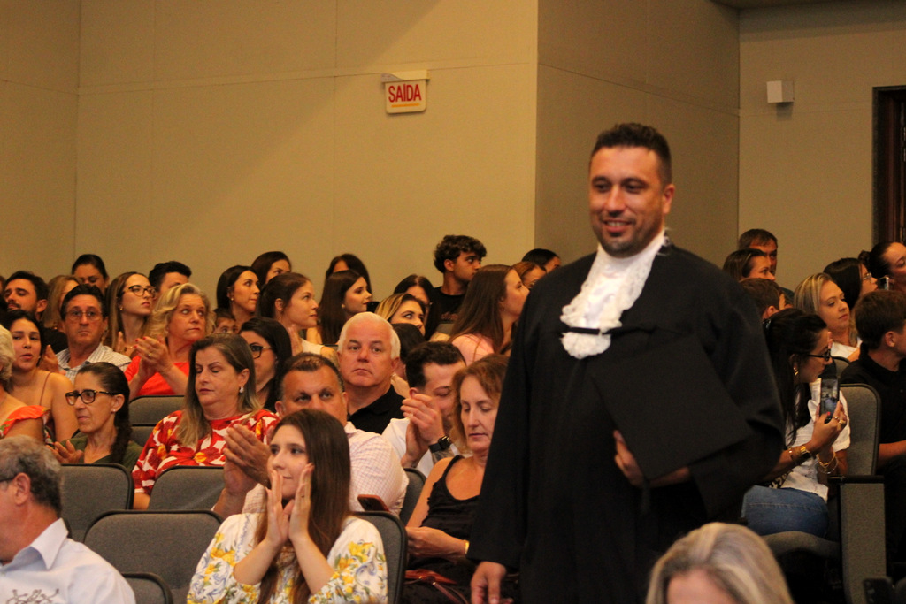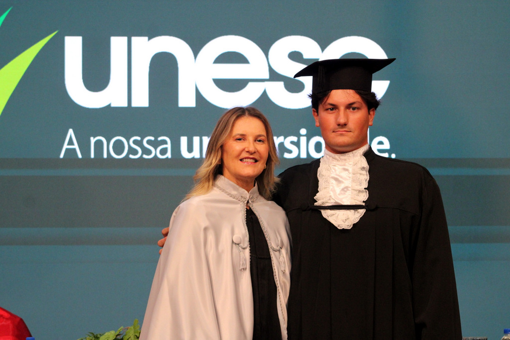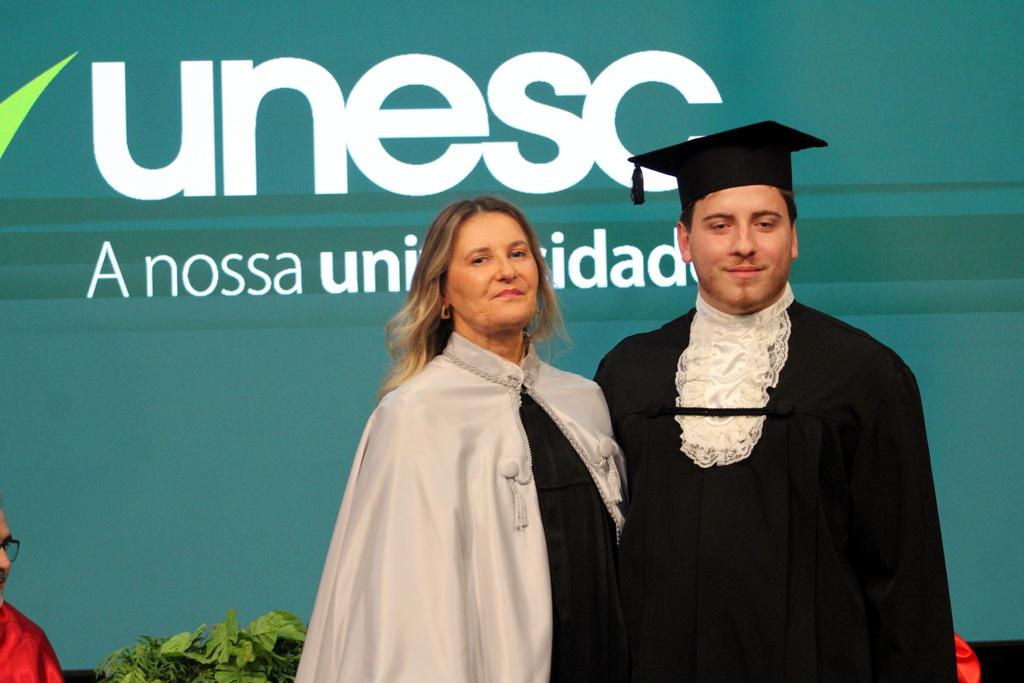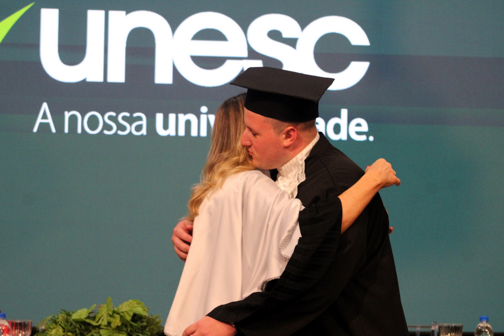 Antes de encerrar o evento, o cerimonialista Laênio Ghisi reservou um momento de profunda sensibilidade dedicado aos pais e mães presentes. Em todas as suas sessões de colação de grau, a Unesc reitera que o apoio familiar é o pilar fundamental para o sucesso acadêmico, descrevendo a conquista do diploma como uma vitória compartilhada entre todos os familiares.