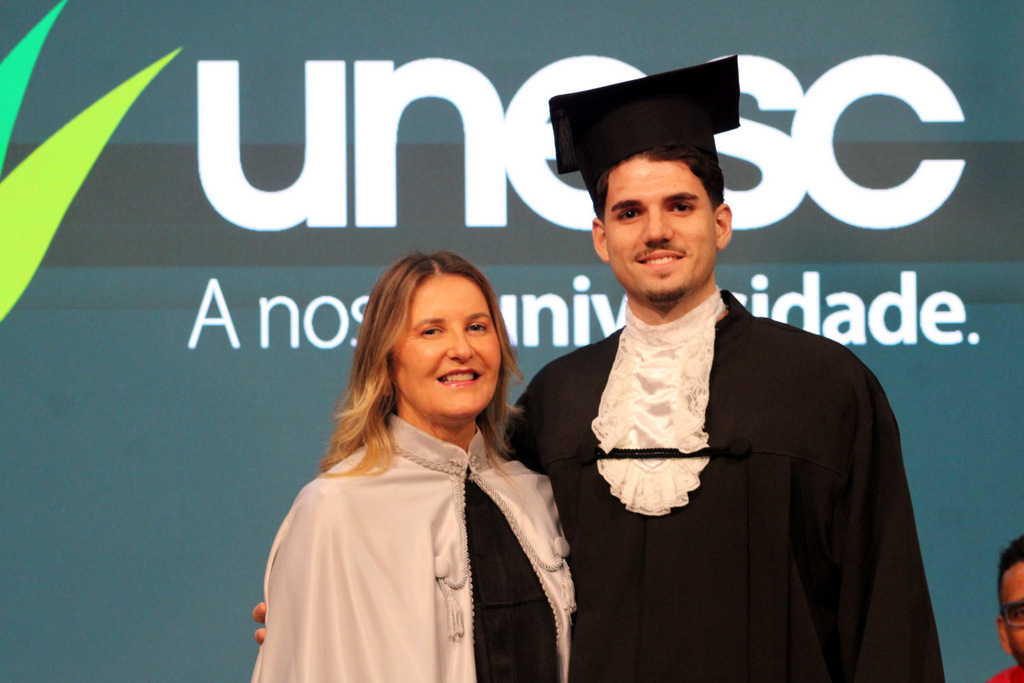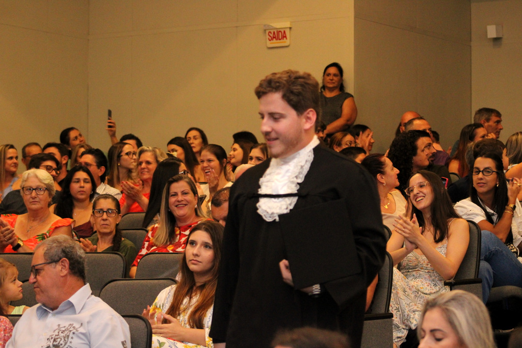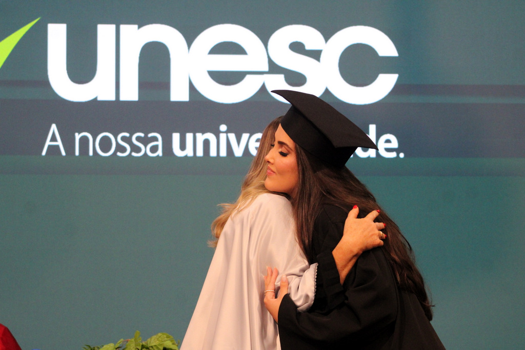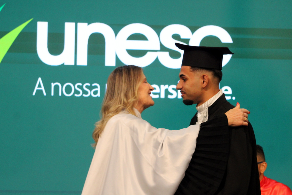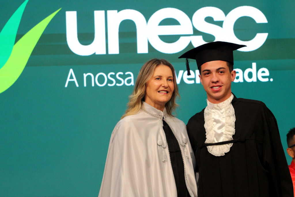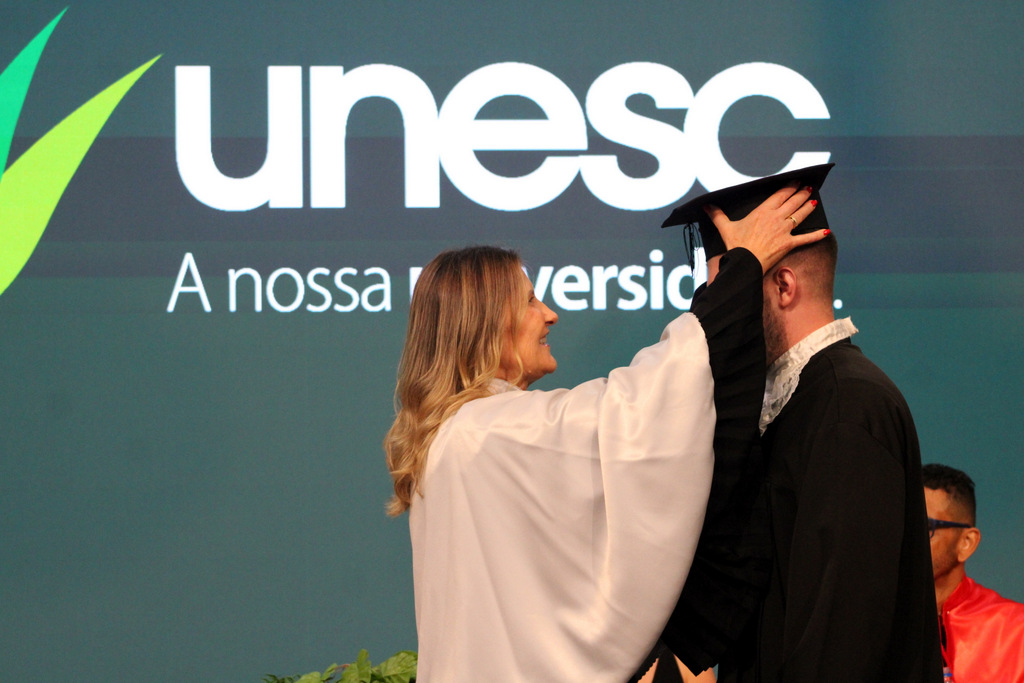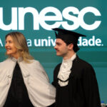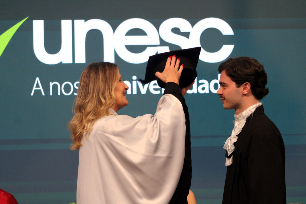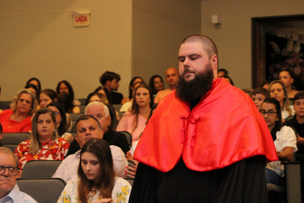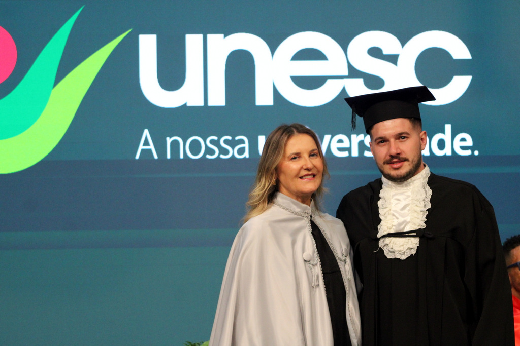Antes de encerrar o evento, o cerimonialista Laênio Ghisi reservou um momento de profunda sensibilidade dedicado aos pais e mães presentes. Em todas as suas sessões de colação de grau, a Unesc reitera que o apoio familiar é o pilar fundamental para o sucesso acadêmico, descrevendo a conquista do diploma como uma vitória compartilhada entre todos os familiares.