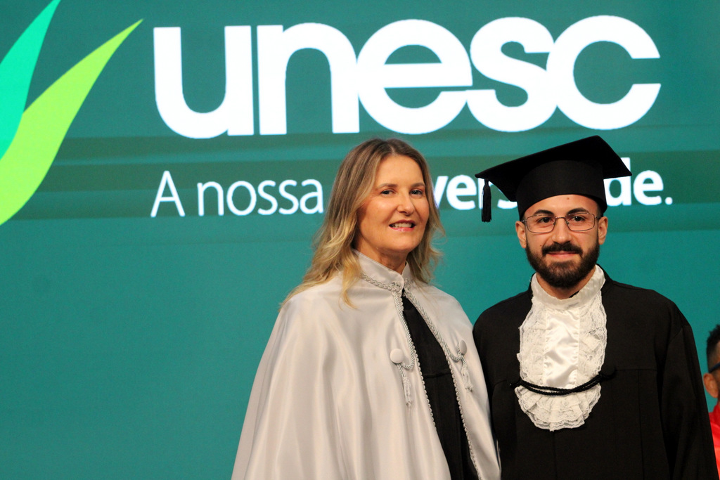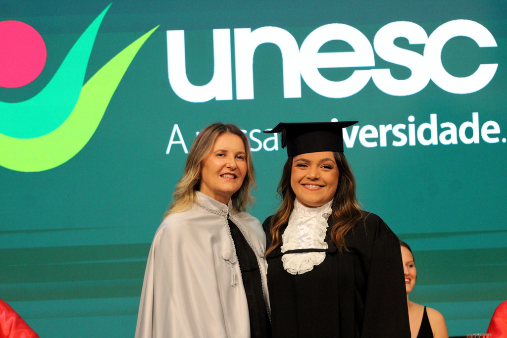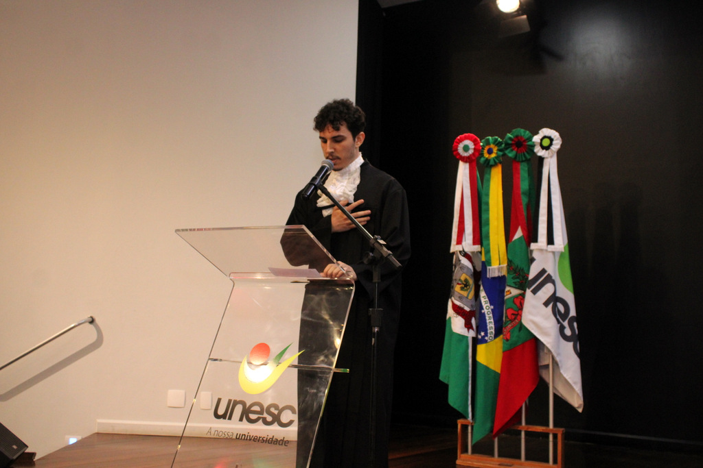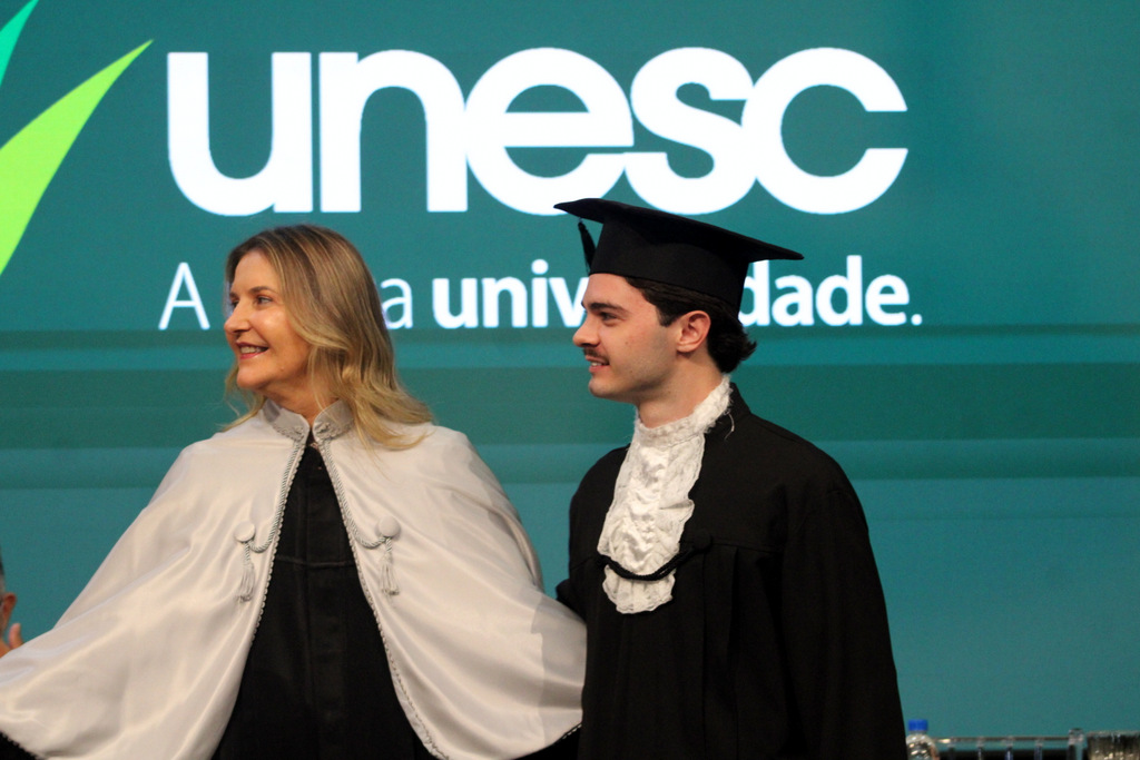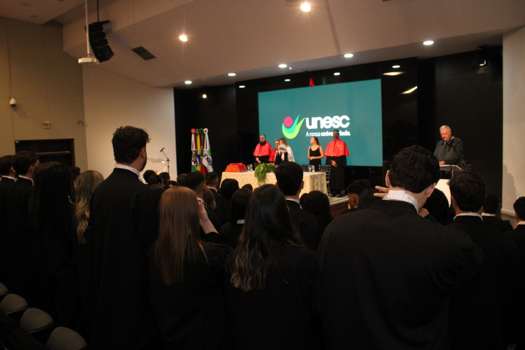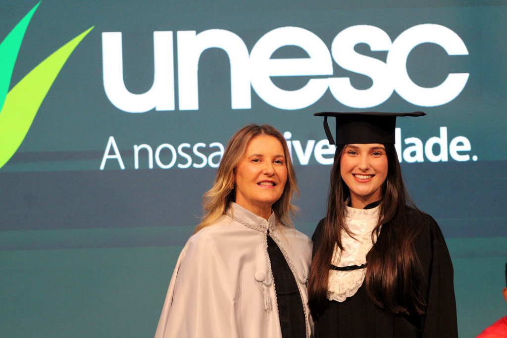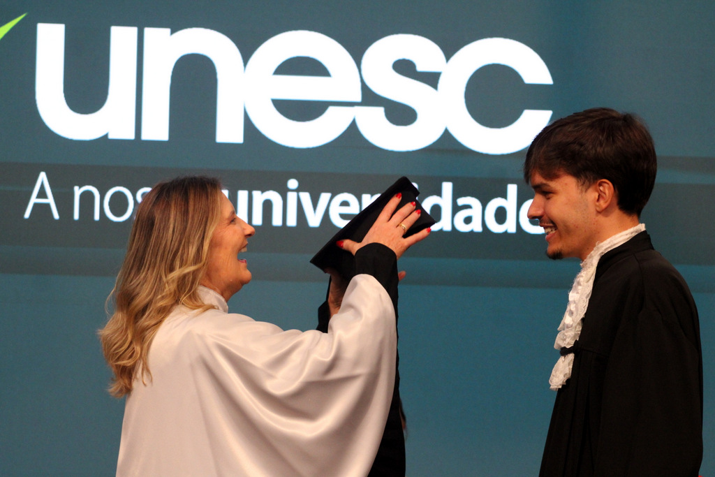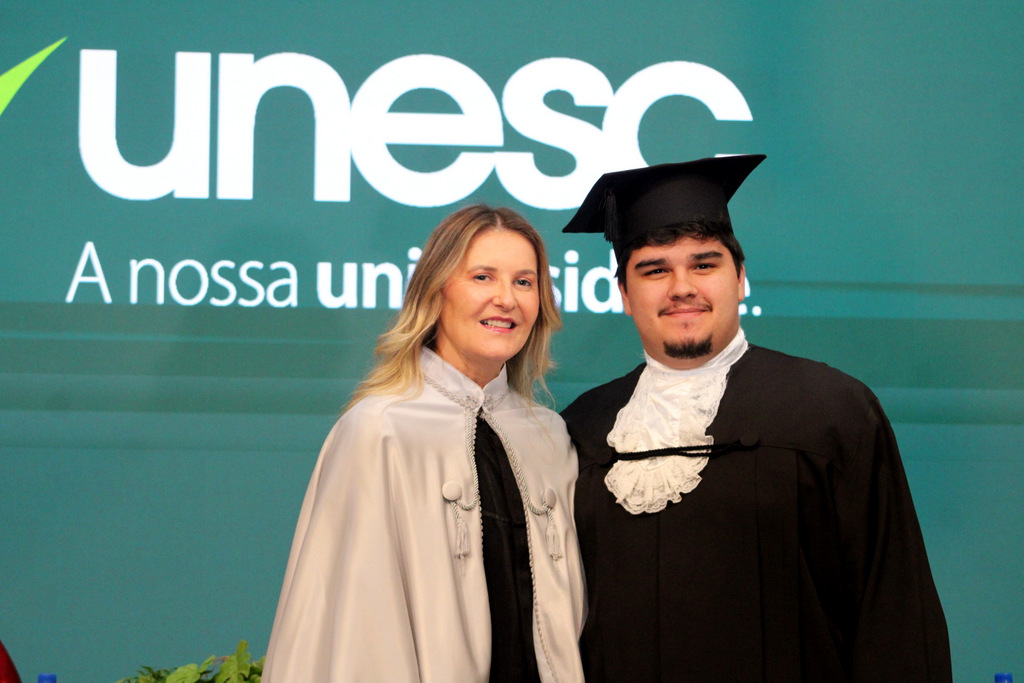 Antes de encerrar o evento, o cerimonialista Laênio Ghisi reservou um momento de profunda sensibilidade dedicado aos pais e mães presentes. Em todas as suas sessões de colação de grau, a Unesc reitera que o apoio familiar é o pilar fundamental para o sucesso acadêmico, descrevendo a conquista do diploma como uma vitória compartilhada entre todos os familiares.
