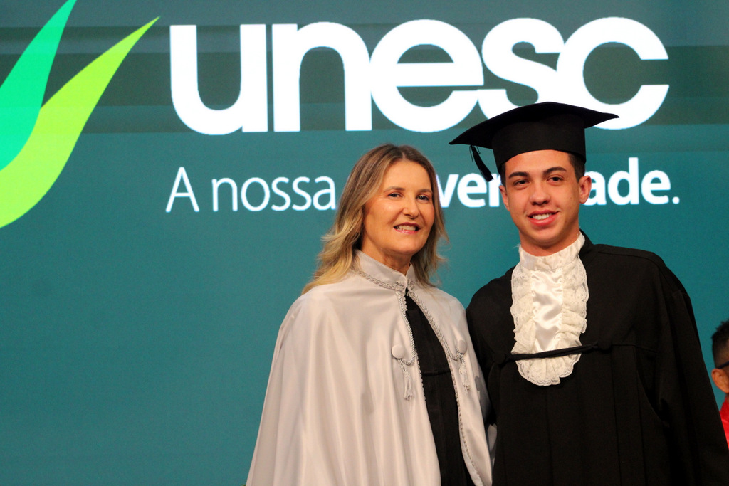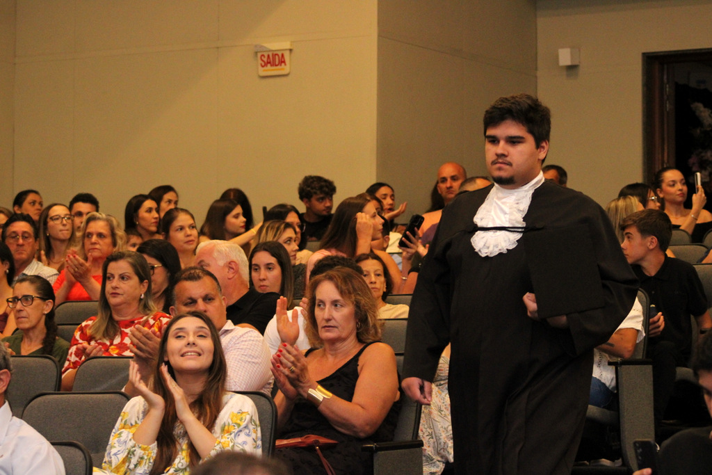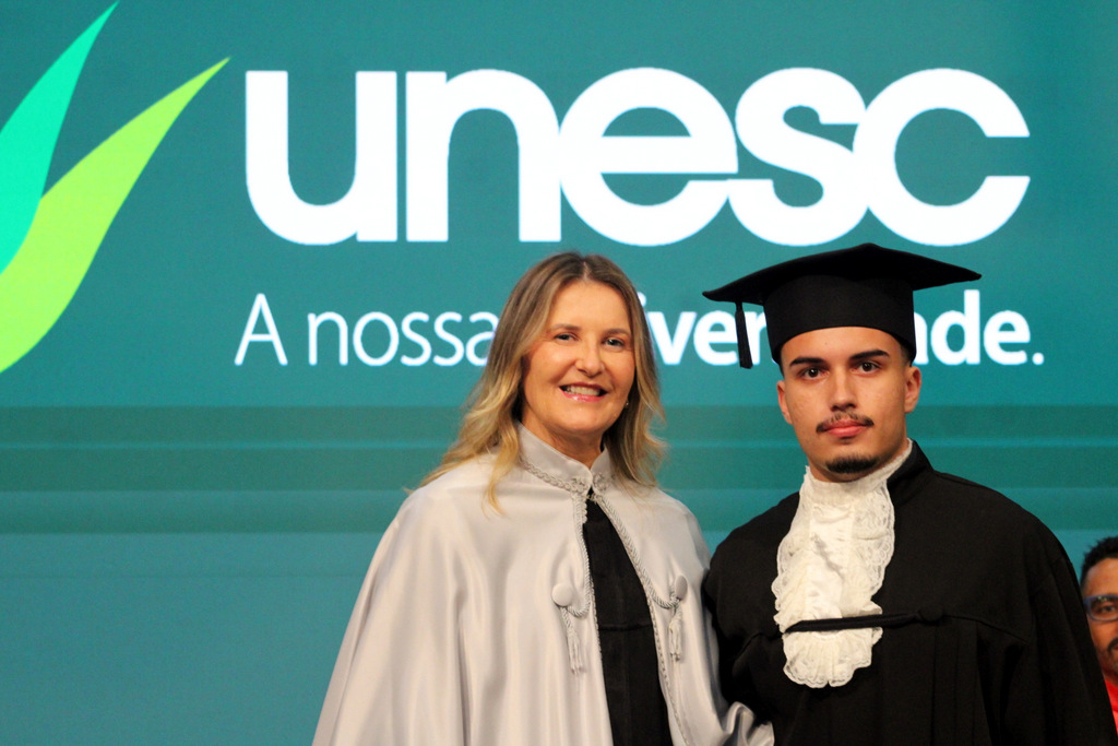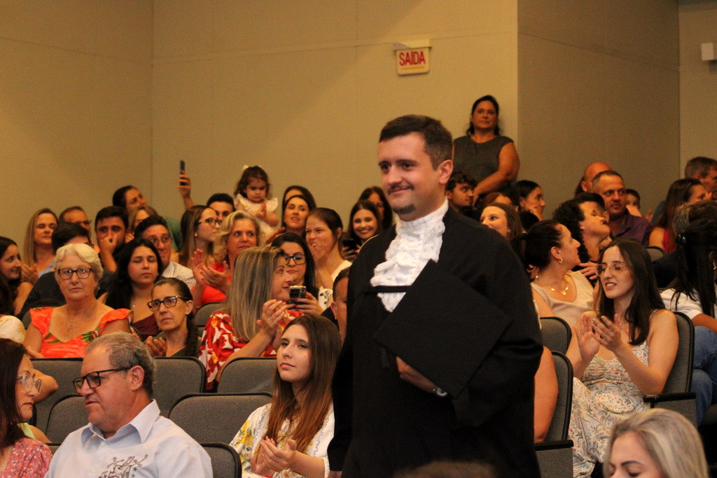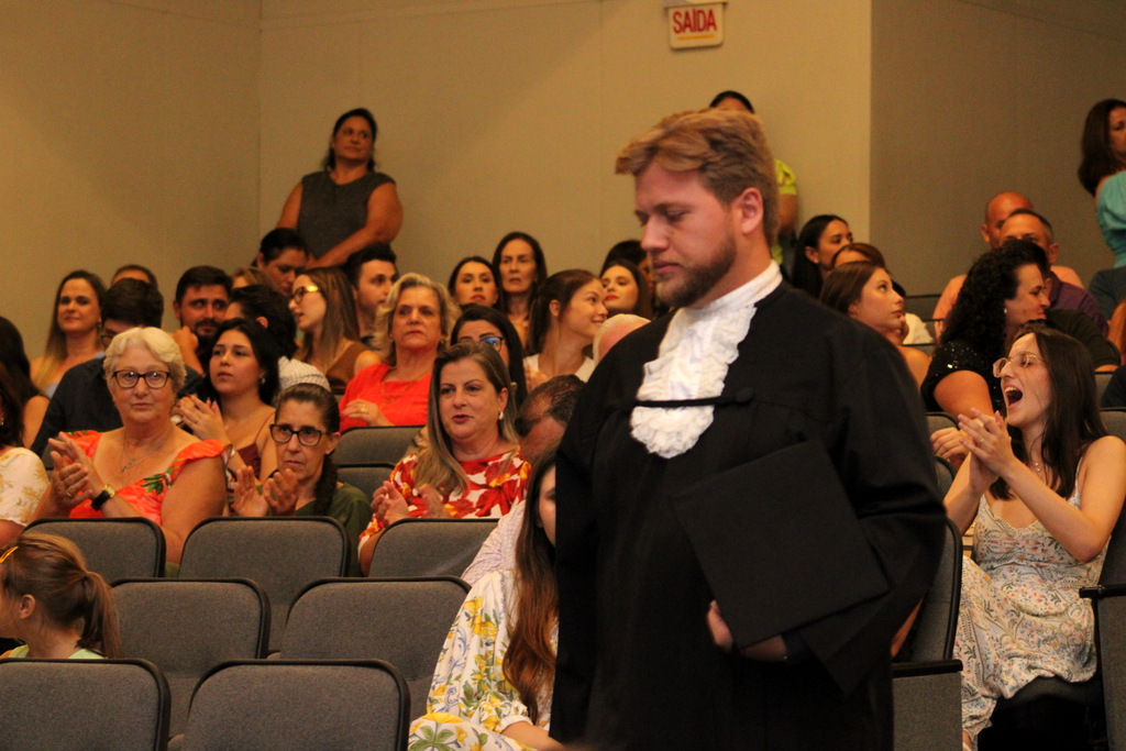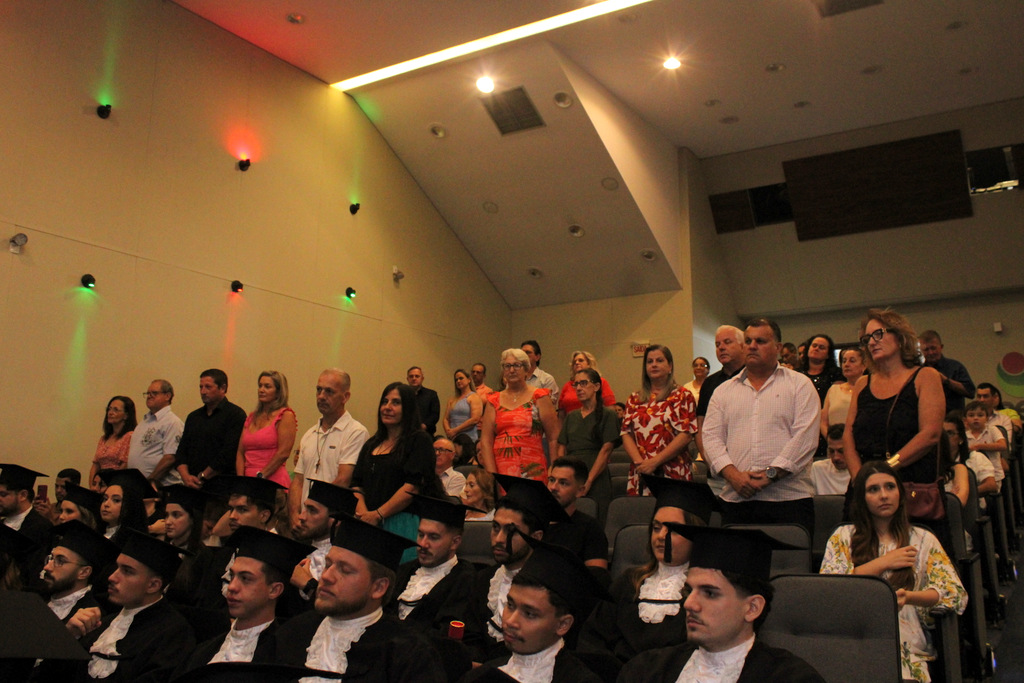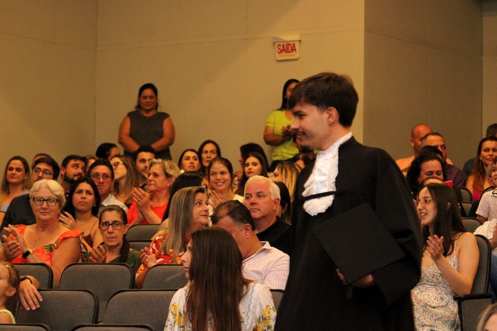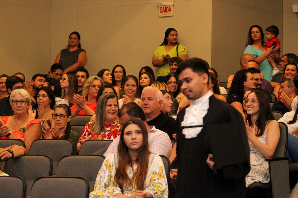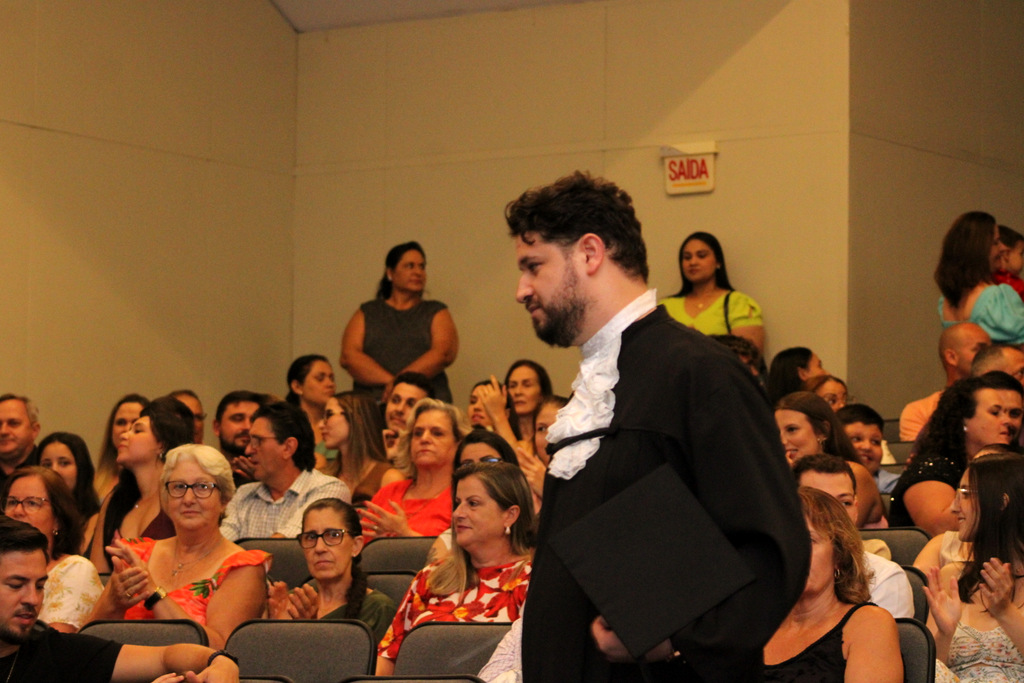 Antes de encerrar o evento, o cerimonialista Laênio Ghisi reservou um momento de profunda sensibilidade dedicado aos pais e mães presentes. Em todas as suas sessões de colação de grau, a Unesc reitera que o apoio familiar é o pilar fundamental para o sucesso acadêmico, descrevendo a conquista do diploma como uma vitória compartilhada entre todos os familiares.