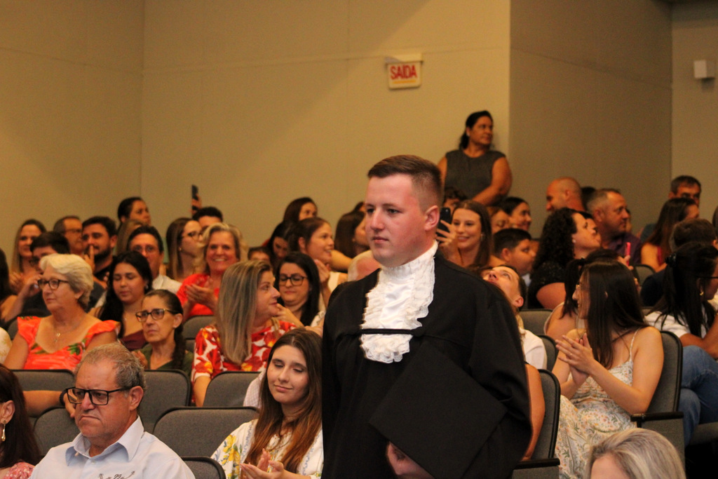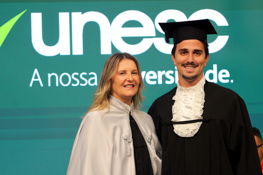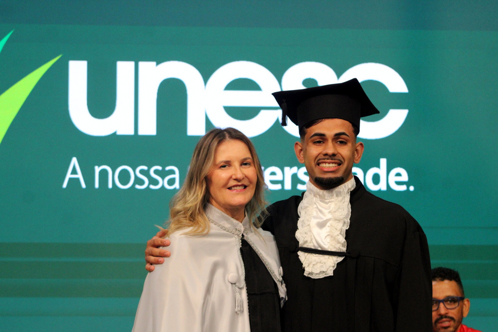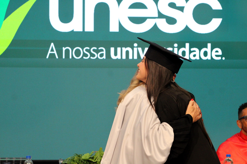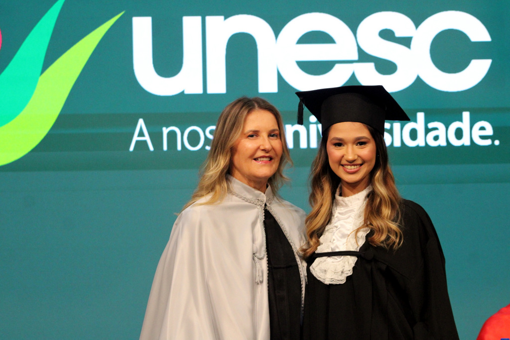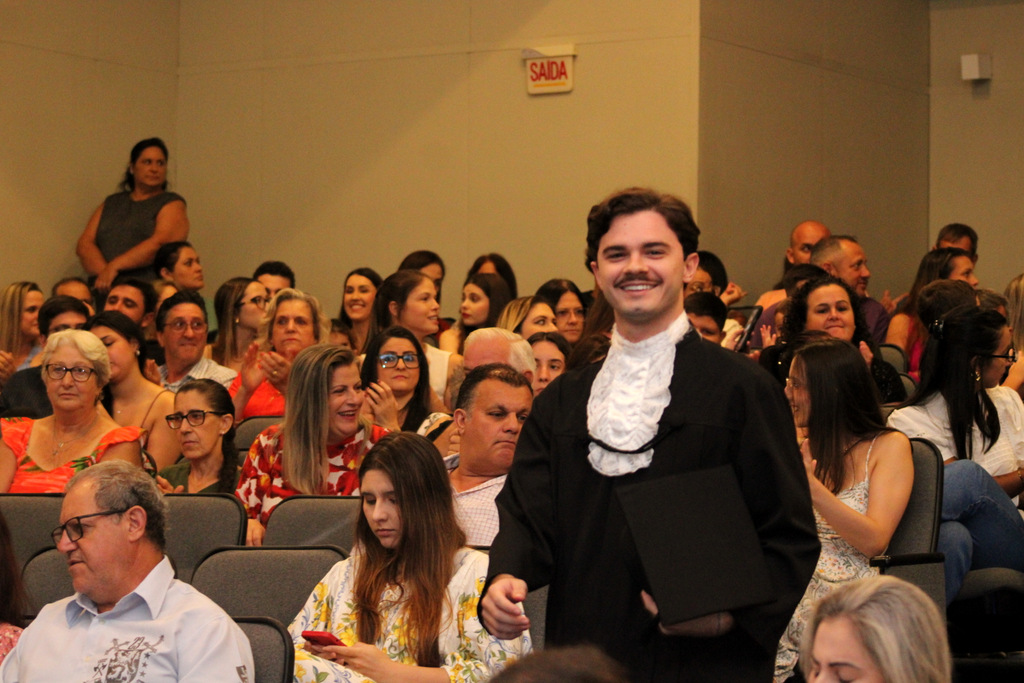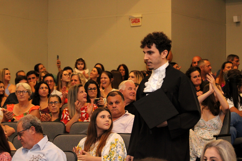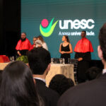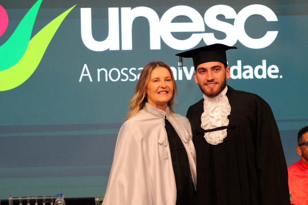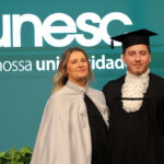 Antes de encerrar o evento, o cerimonialista Laênio Ghisi reservou um momento de profunda sensibilidade dedicado aos pais e mães presentes. Em todas as suas sessões de colação de grau, a Unesc reitera que o apoio familiar é o pilar fundamental para o sucesso acadêmico, descrevendo a conquista do diploma como uma vitória compartilhada entre todos os familiares.