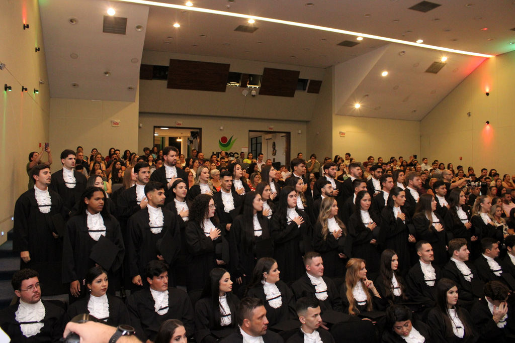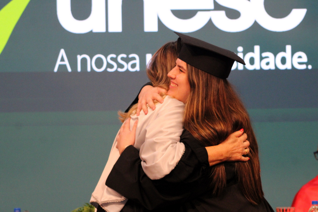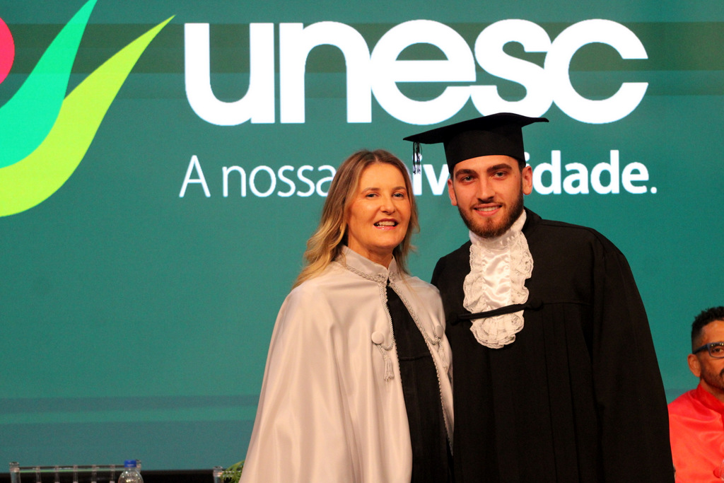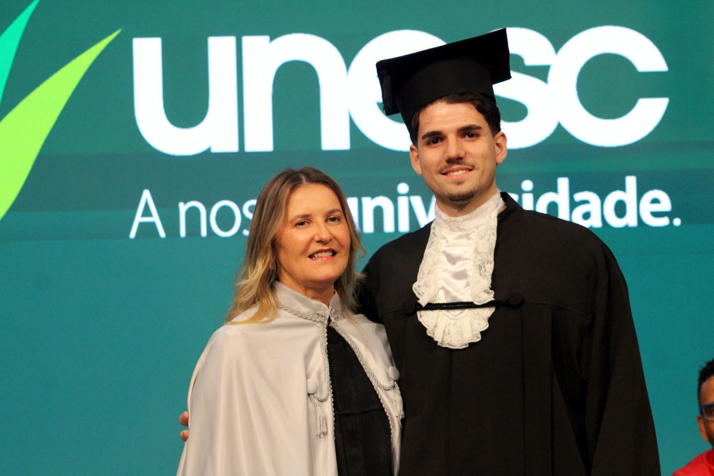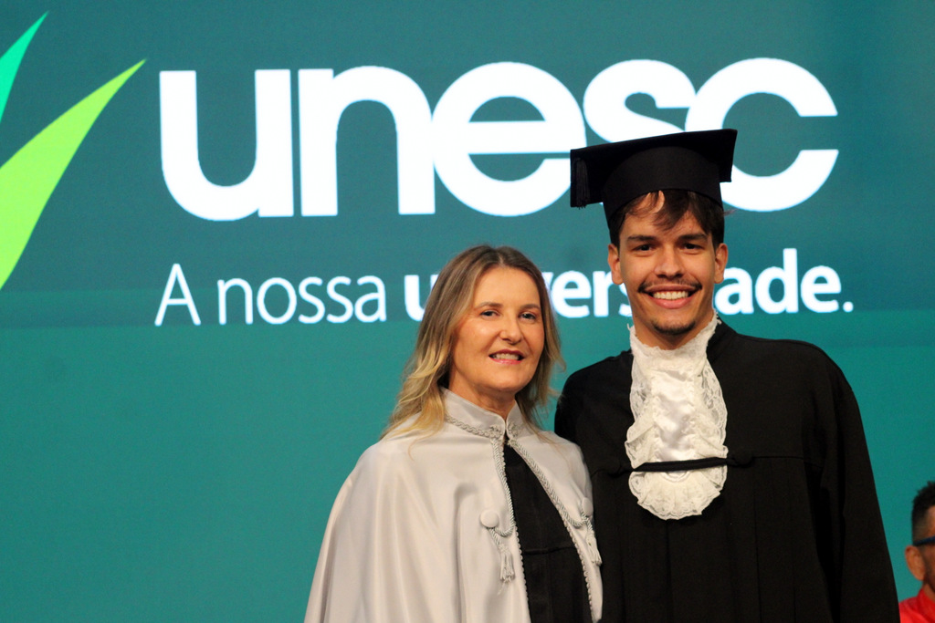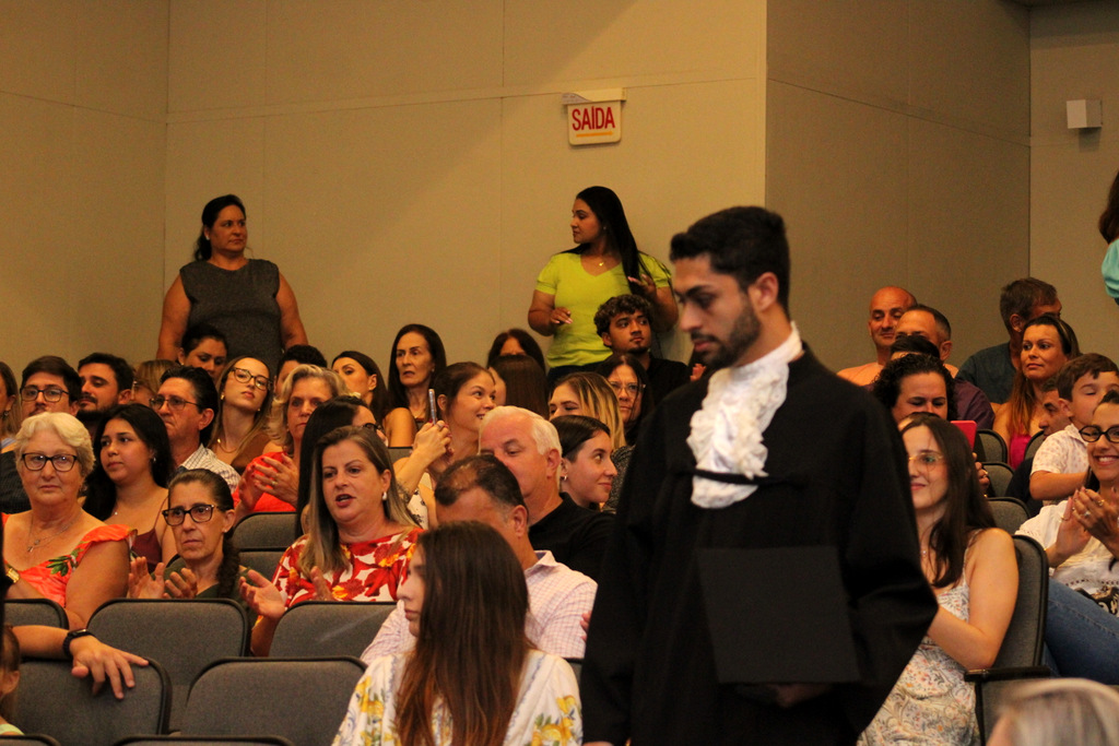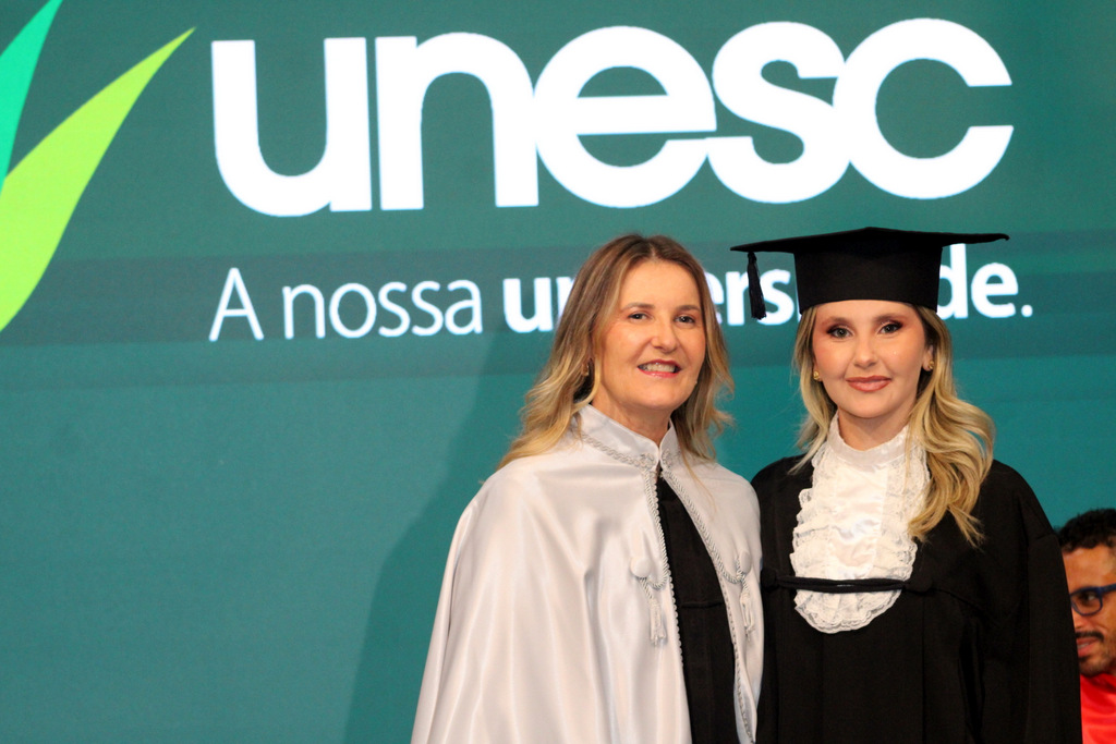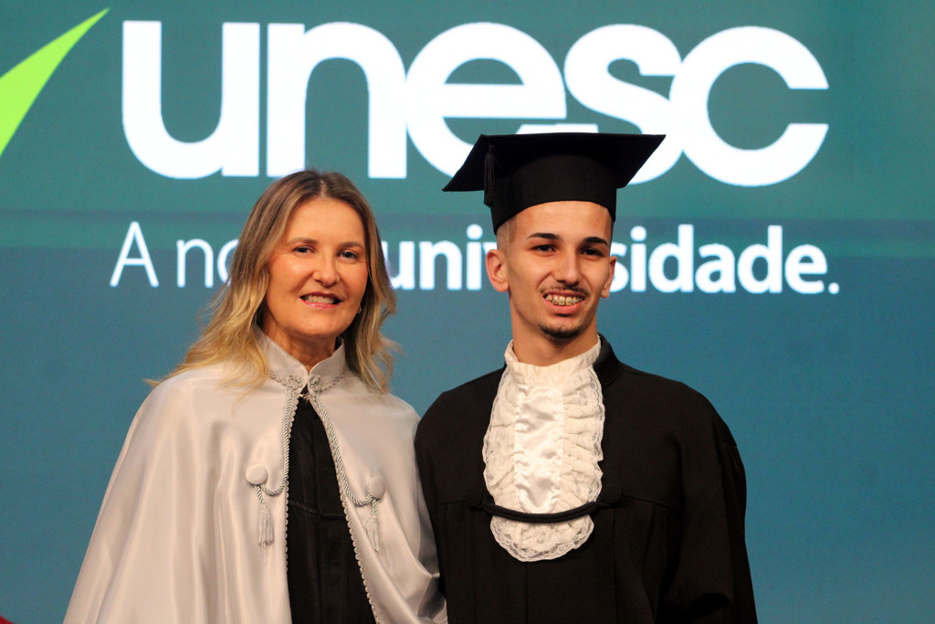 Antes de encerrar o evento, o cerimonialista Laênio Ghisi reservou um momento de profunda sensibilidade dedicado aos pais e mães presentes. Em todas as suas sessões de colação de grau, a Unesc reitera que o apoio familiar é o pilar fundamental para o sucesso acadêmico, descrevendo a conquista do diploma como uma vitória compartilhada entre todos os familiares.