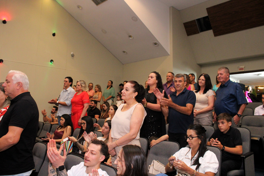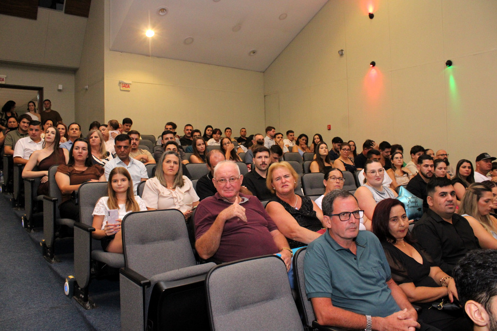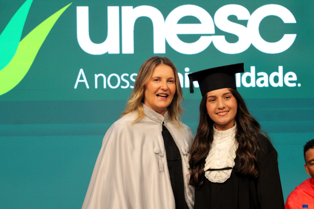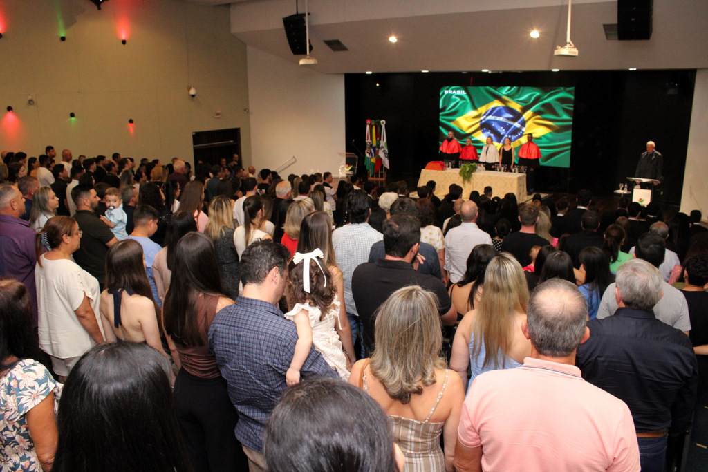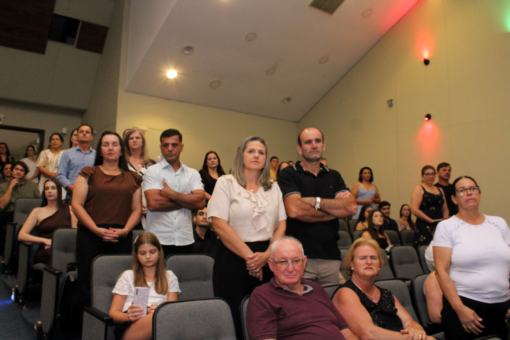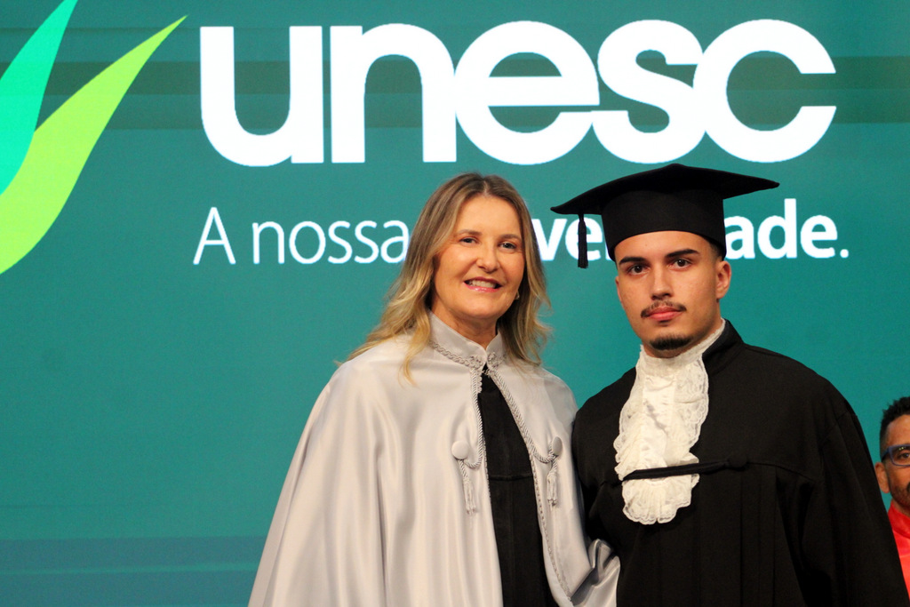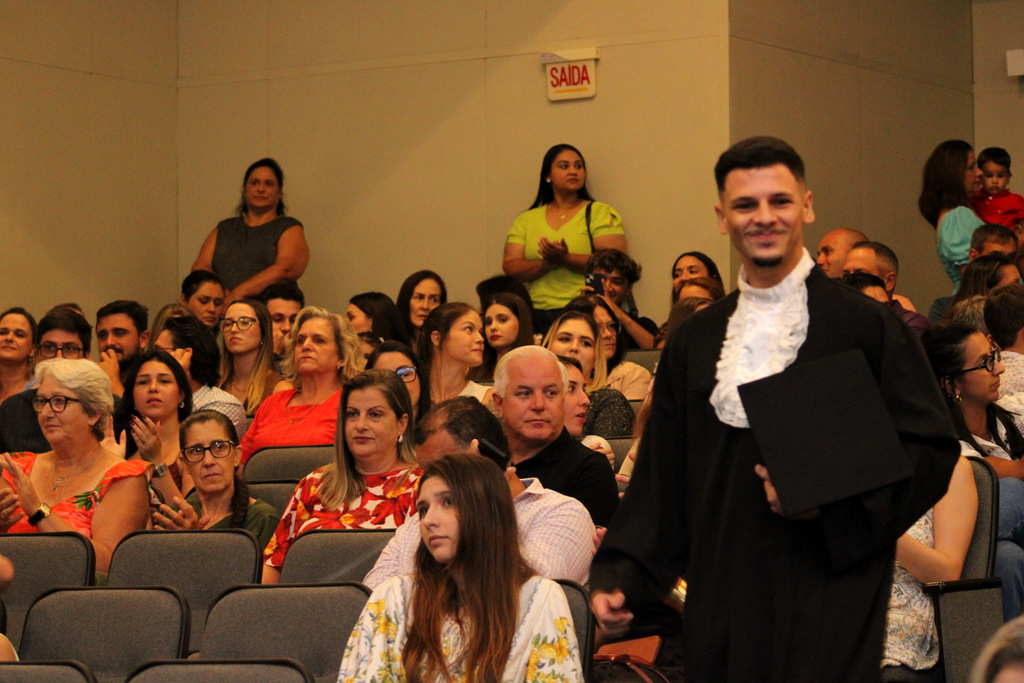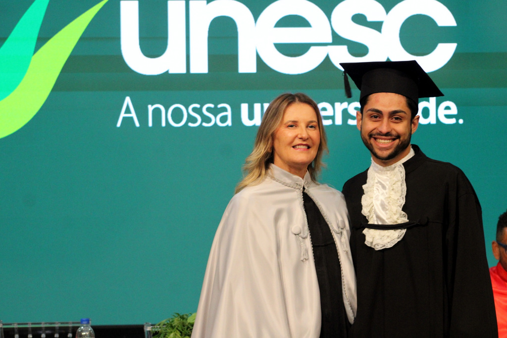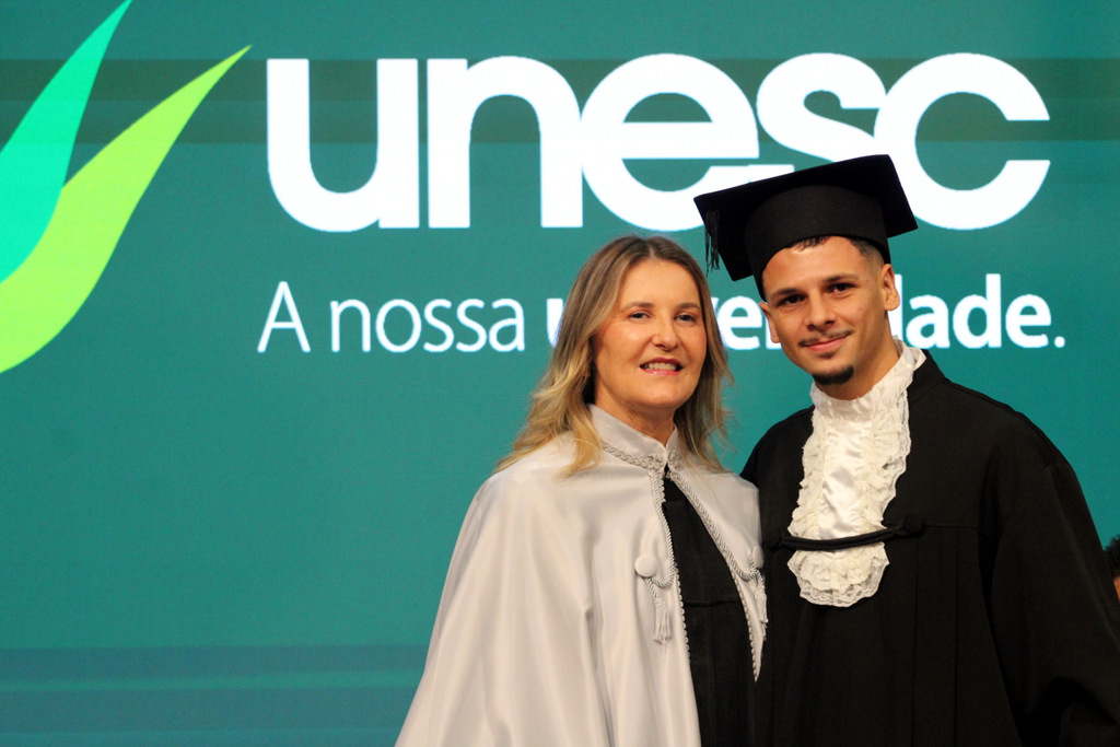 Antes de encerrar o evento, o cerimonialista Laênio Ghisi reservou um momento de profunda sensibilidade dedicado aos pais e mães presentes. Em todas as suas sessões de colação de grau, a Unesc reitera que o apoio familiar é o pilar fundamental para o sucesso acadêmico, descrevendo a conquista do diploma como uma vitória compartilhada entre todos os familiares.