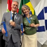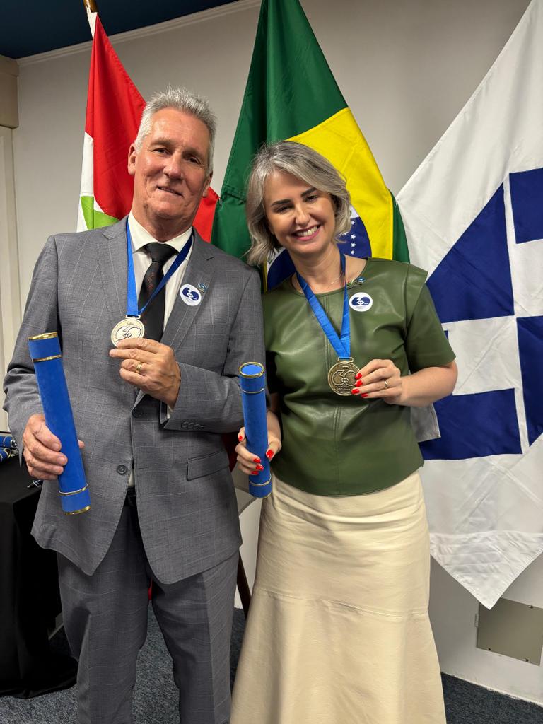 Gisele Silveira Coelho Lopes e Abel Corrêa de Souza receberam a Medalha Comemorativa dos 60 anos da Administração pela contribuição à área e à formação de líderes comprometidos com o desenvolvimento do estado e do país. (Fotos: Marciano Bortolin e Assessoria de Imprensa CRA/SC)